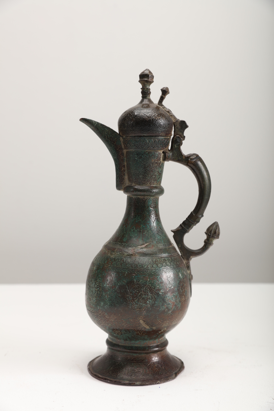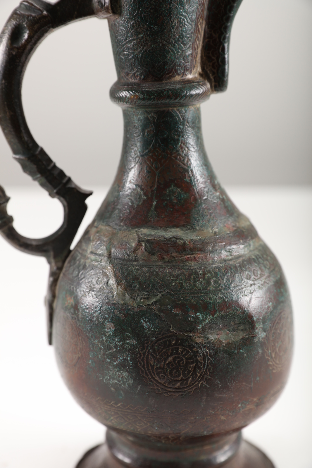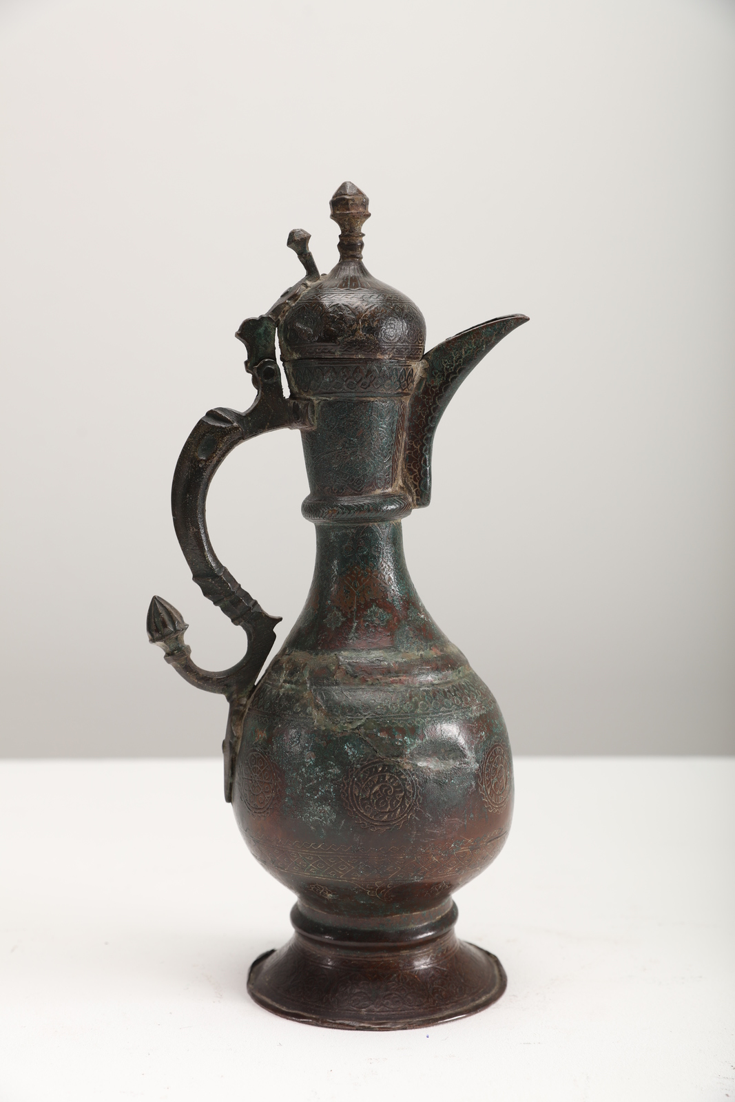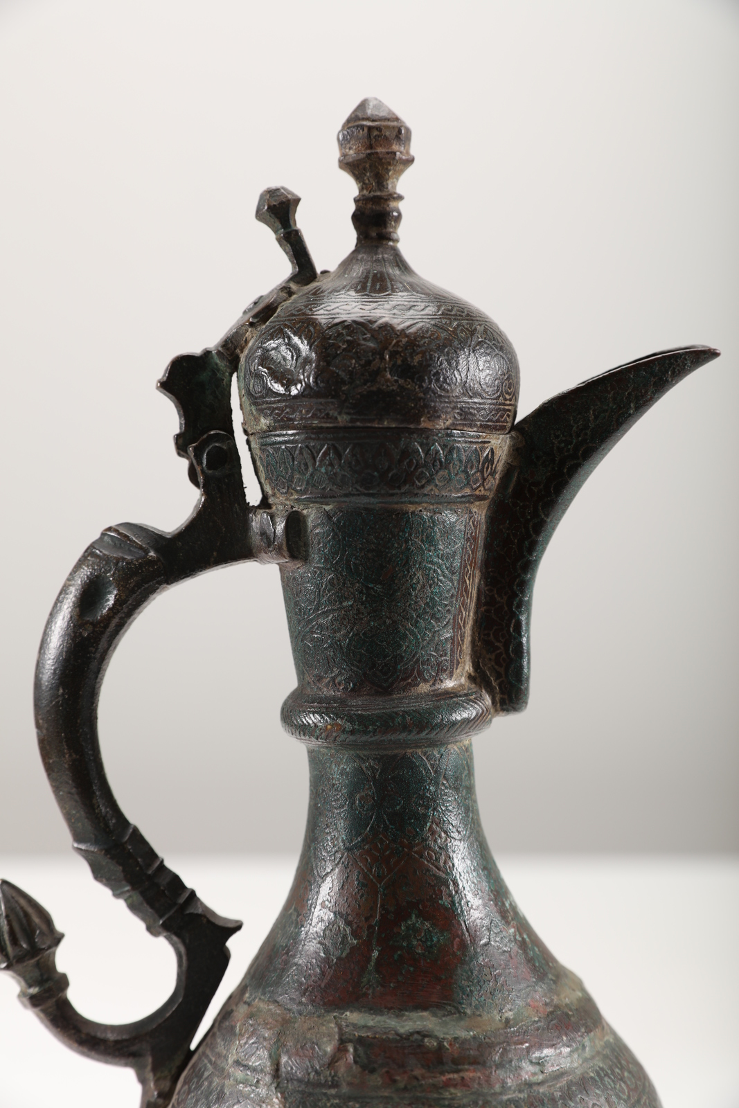 Arte Islamica Brocca in bronzo con decorazione incisa e manico a forma di dragone