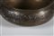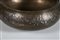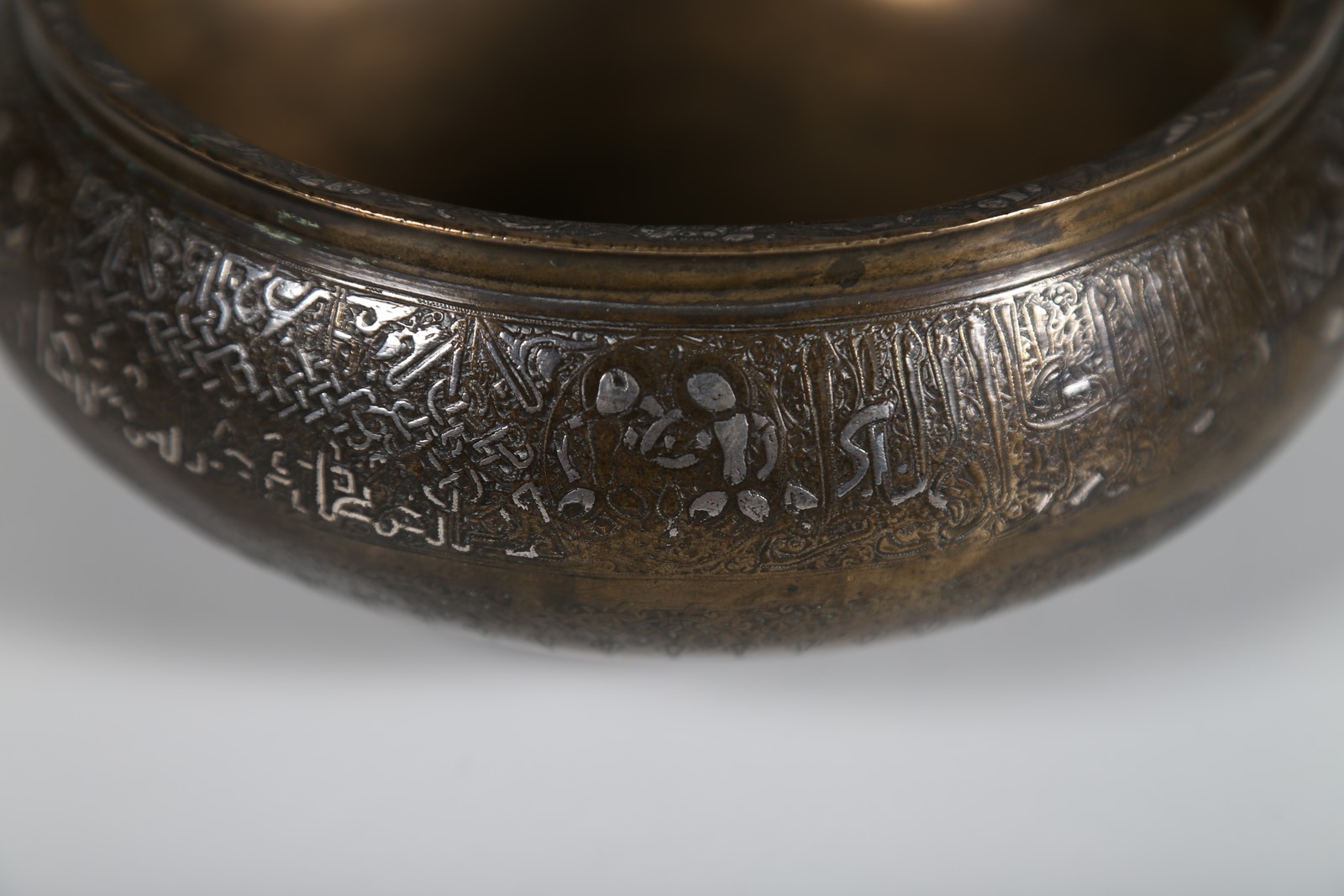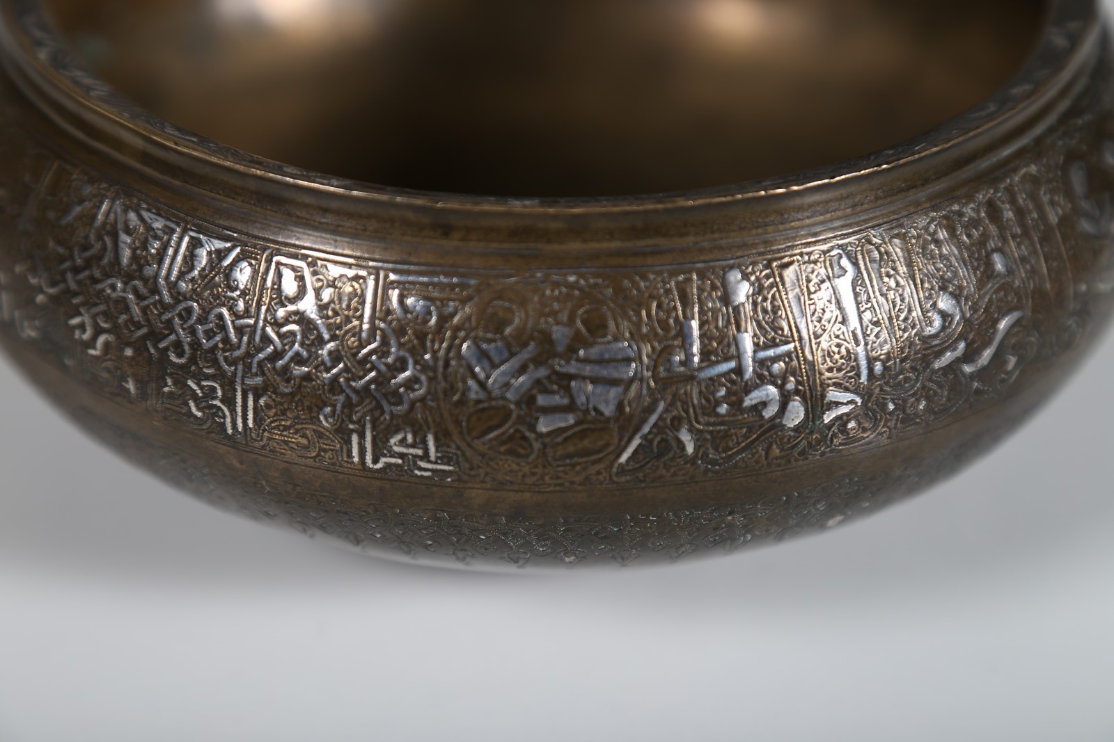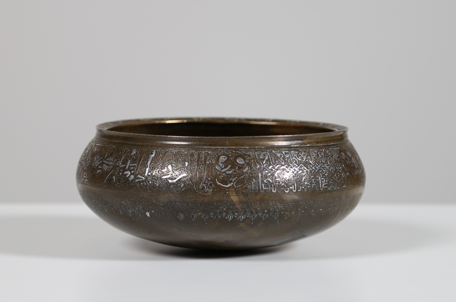 Probabilmente Damasco, seconda metà XIII secolo . -. Cm 18,00 x 9,00. Di forma circolare con pareti curve, la spalla incisa con ampie iscrizioni in arabo di carattere religioso in cufico annodato sottolineate da cospicui residui di intarsio in argento su sfondo di arabeschi intrecciati e piccole spirali dentate ed intervallate da rondelle contenenti personaggi impegnati in diverse attività, tra cui il braccio di ferro. Il fondo è decorato all'esterno con un medaglione lobato inciso con palmette intrecciate con tracce di intarsio in argento e l'interno mostra un medaglione circolare inciso con tre personaggi su fondo di elementi vegetali e mezze palmette che mostra ancora la puntinatura che doveva ospitare l'originario intarsio, ora perso essendo la parte più esposta all'usura. Il bordo reca anch'esso una decorazione concatenata raffigurante animali in corsa che spicca sul metallo grazie all'intarsio, in parte ancora visibile.