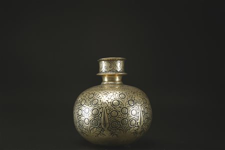 ARTE ISLAMICA Base di huqqa in ottone incisa a motivo floreale India...