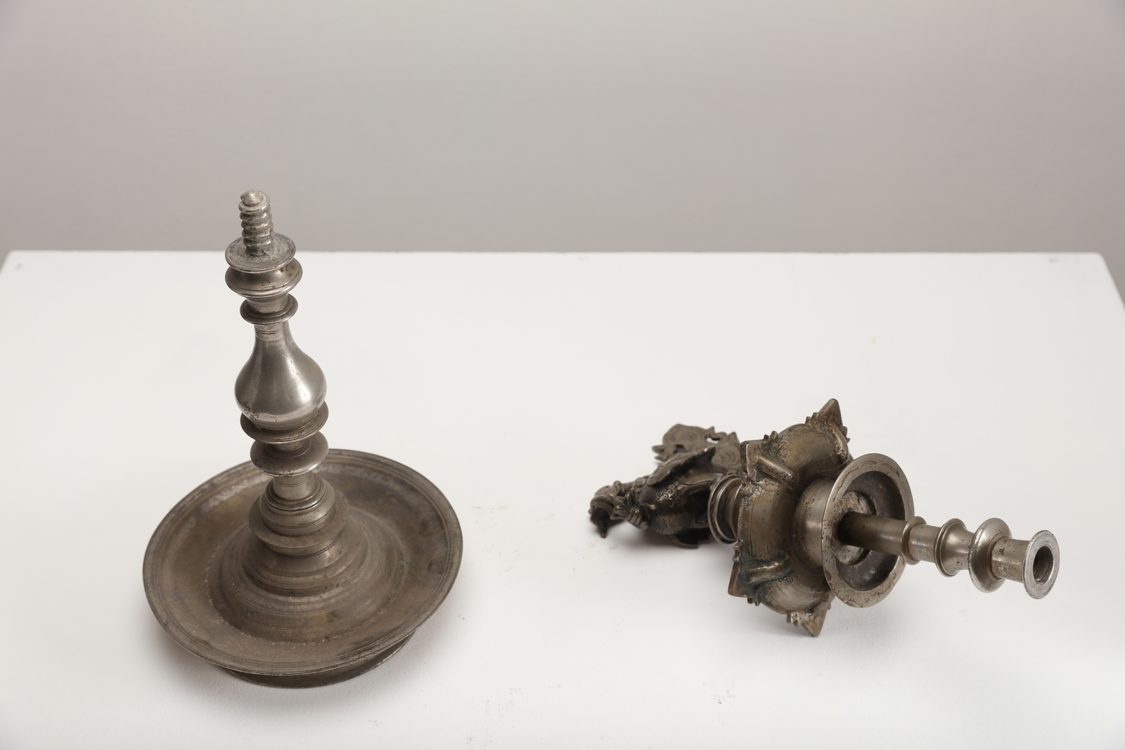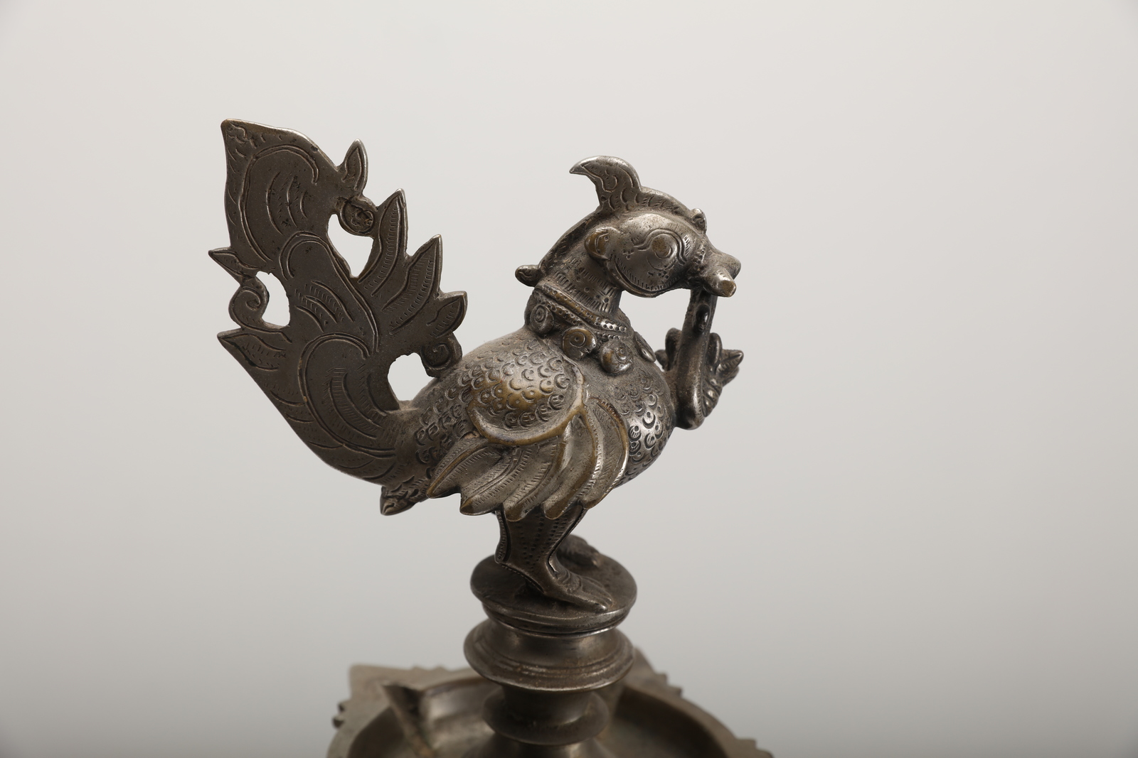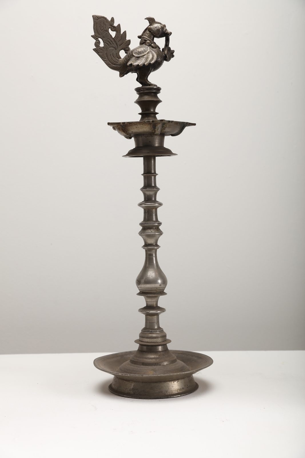 India, XVIII secolo . -. Cm 18,50 x 60,00. Lampada rituale poggiante su piatto circolare su cui si erge un lungo stelo terminante con la scultura di un pavone, veicolo di diverse divinità tra cui Brahma e Skanda.