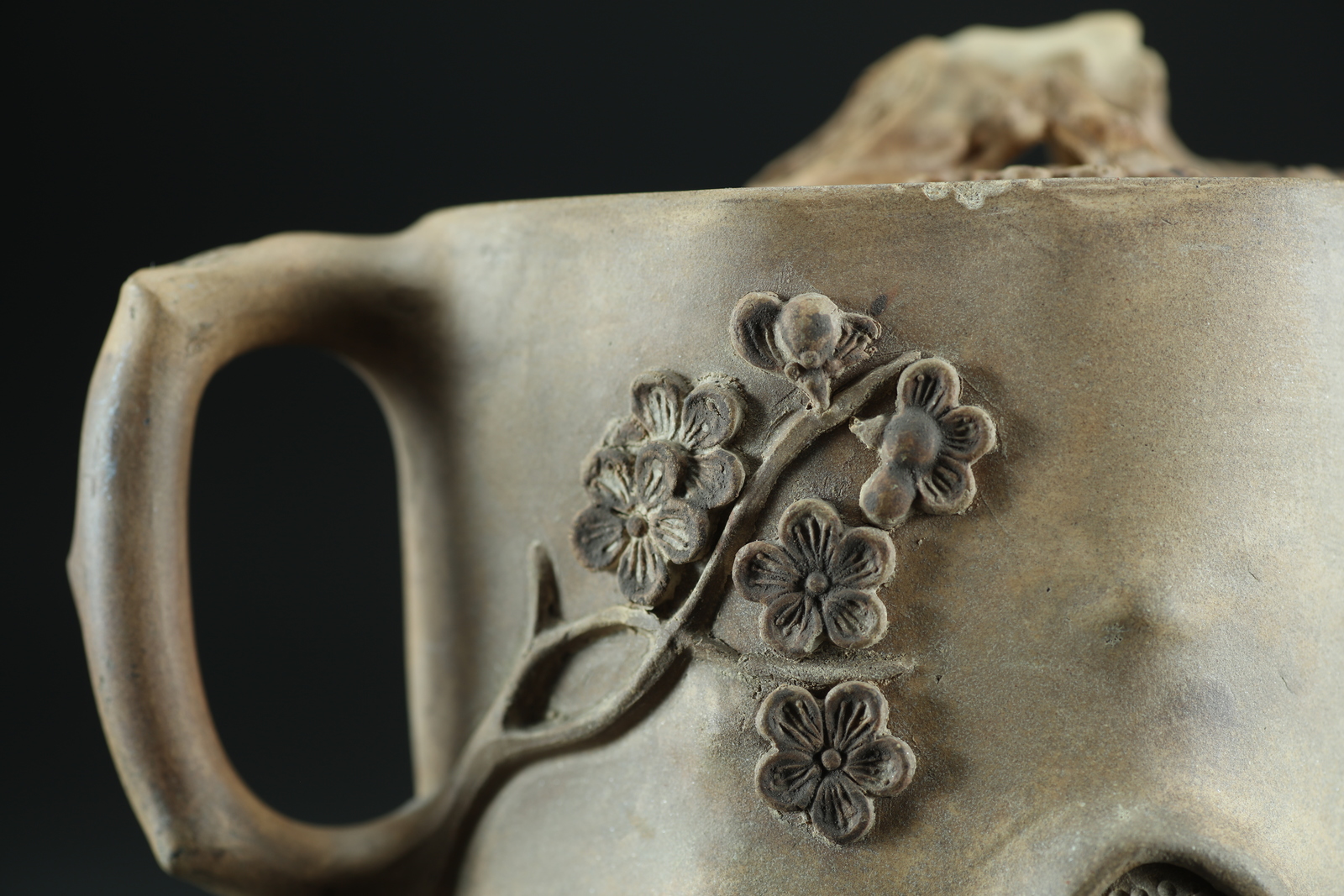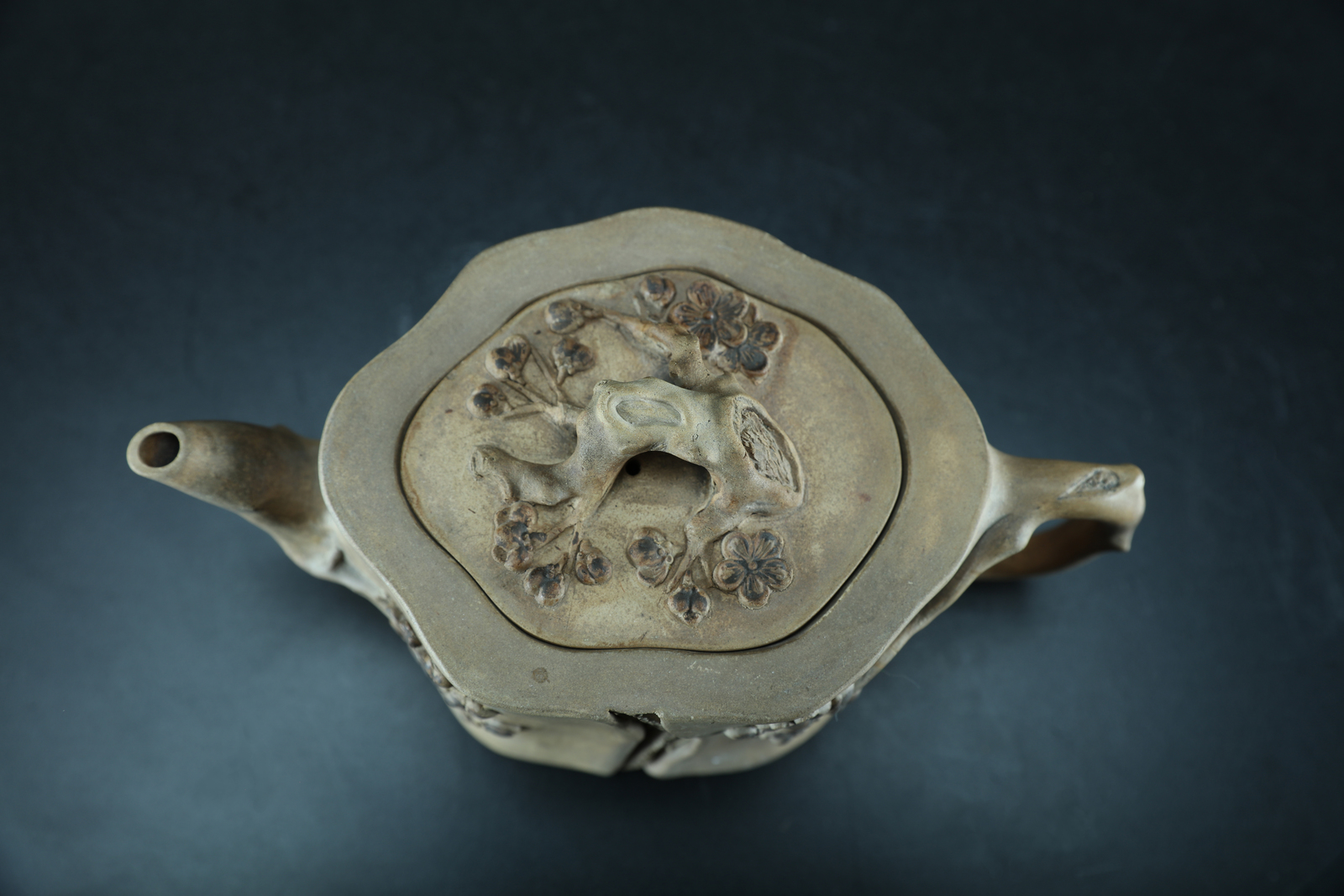 Arte Cinese Beige terracotta yixing teapot in the shape of a wood trunk with prunus flower decor