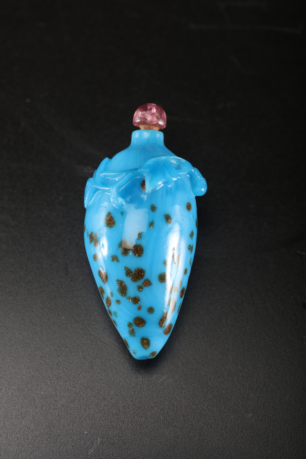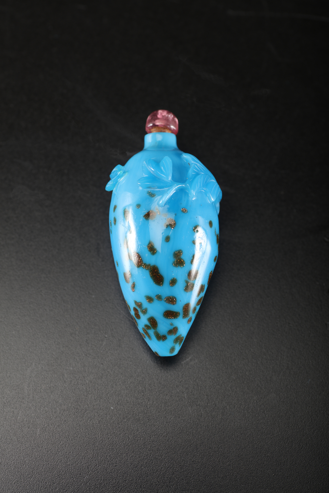 Arte Cinese Tabacchiera in vetro turchese con decorazioni dorate e tappo in quarzo rosa