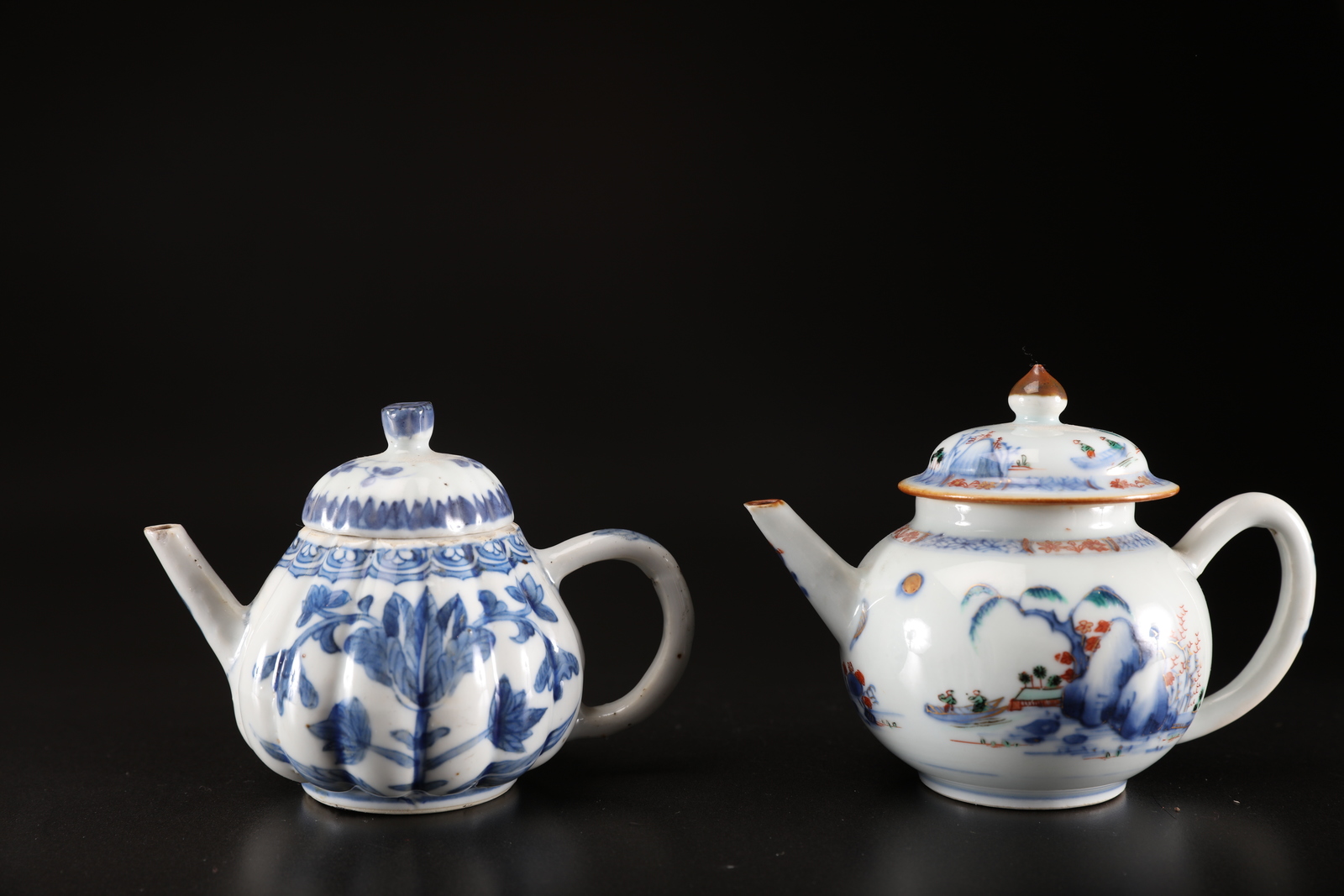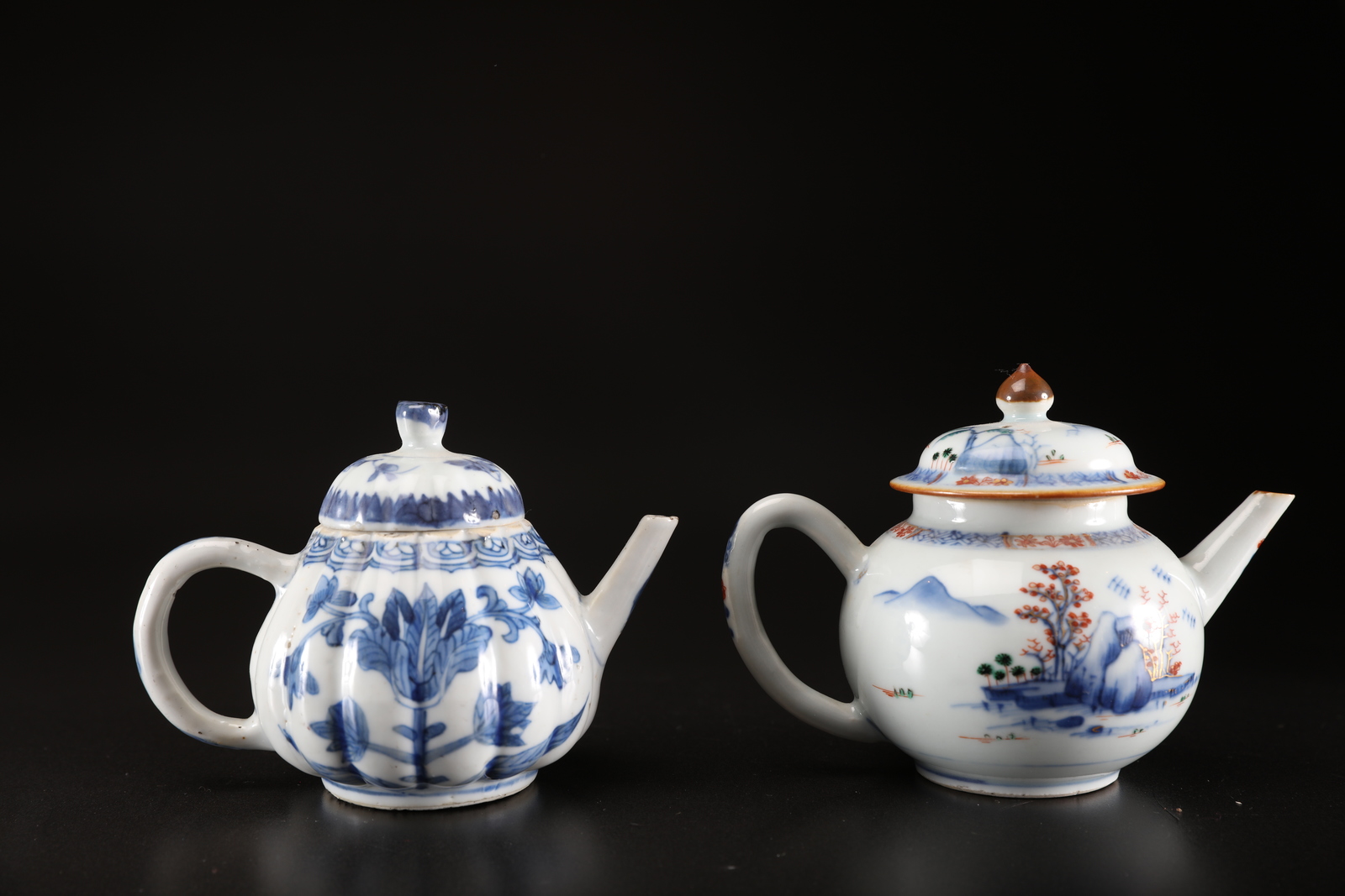 Cina, dinastia Qing, XVIII secolo . -. Cm 11,50. La piccola teriera bianco blu mostra una forma lobata rastremata verso l'alto ed è dipinta con motivi floreali, la teiera imari è dipinta con un paesaggio e piccoli personaggi resi con blu e verde sottocoperta e rosso e oro sopra.