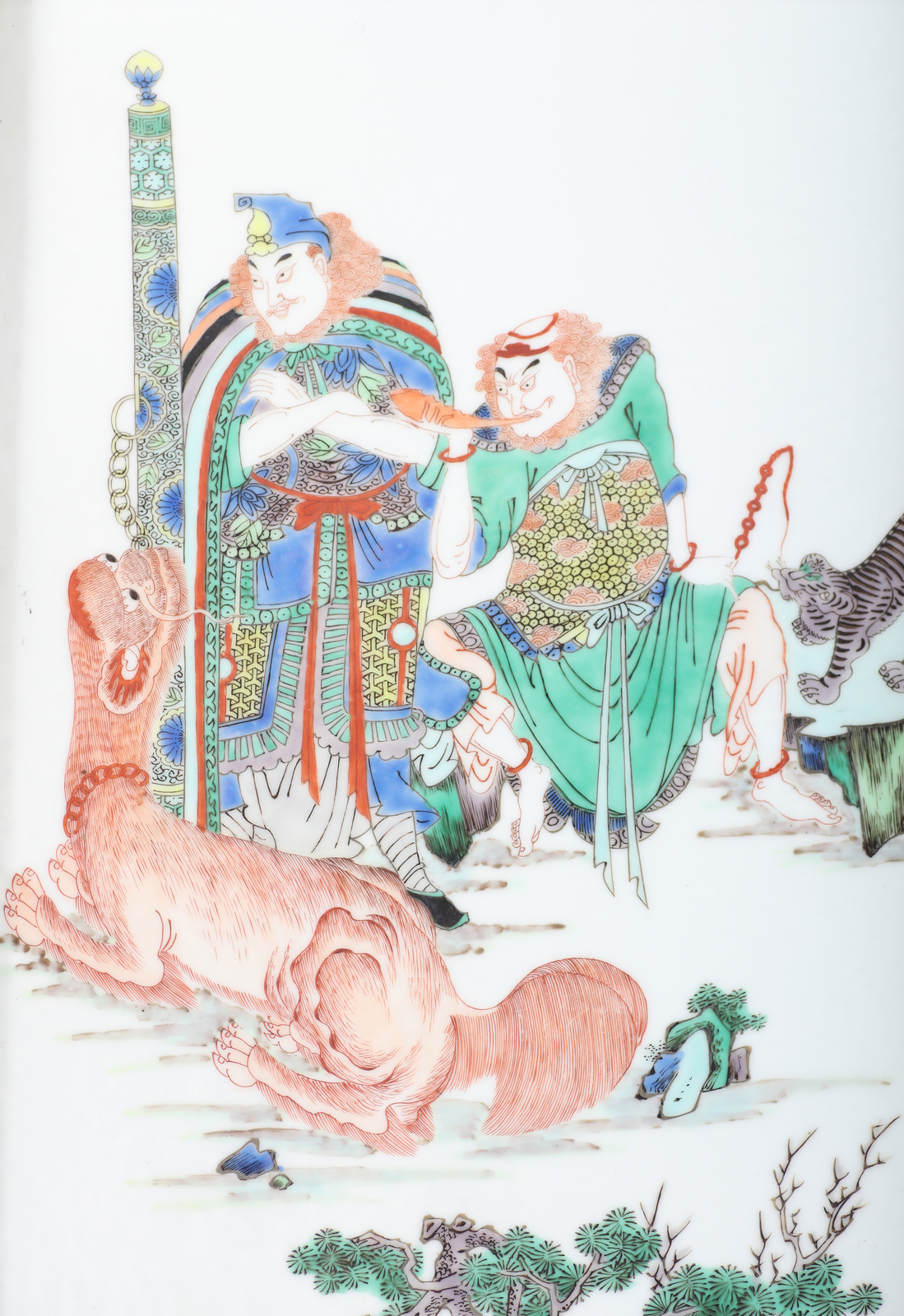 Arte Cinese A polychrome porcelain plaque painted with two figures and a foo dog