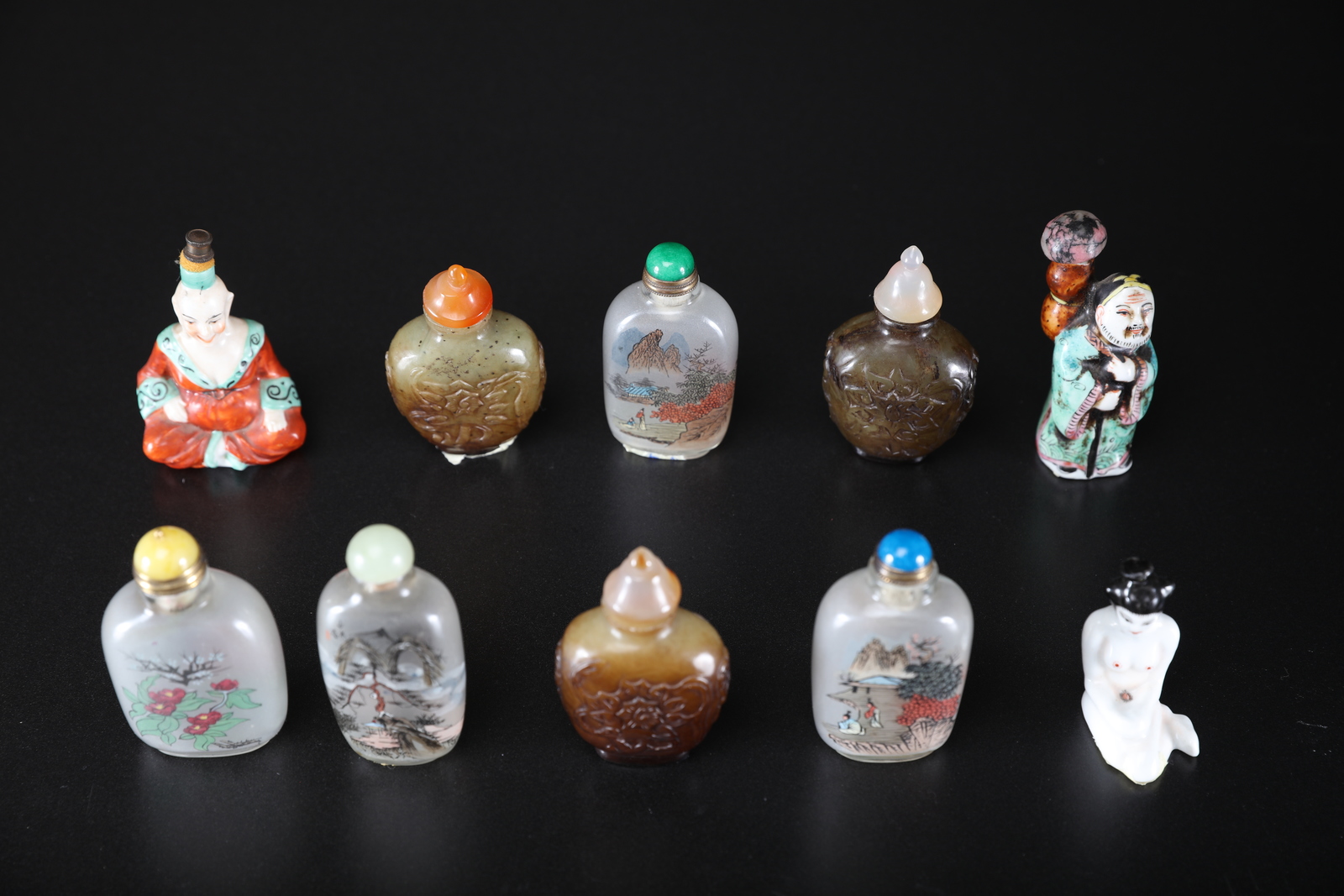 Arte Cinese Lotto composto da dieci tabacchiere di cui tre figurative e sette in giada o vetro dipinto