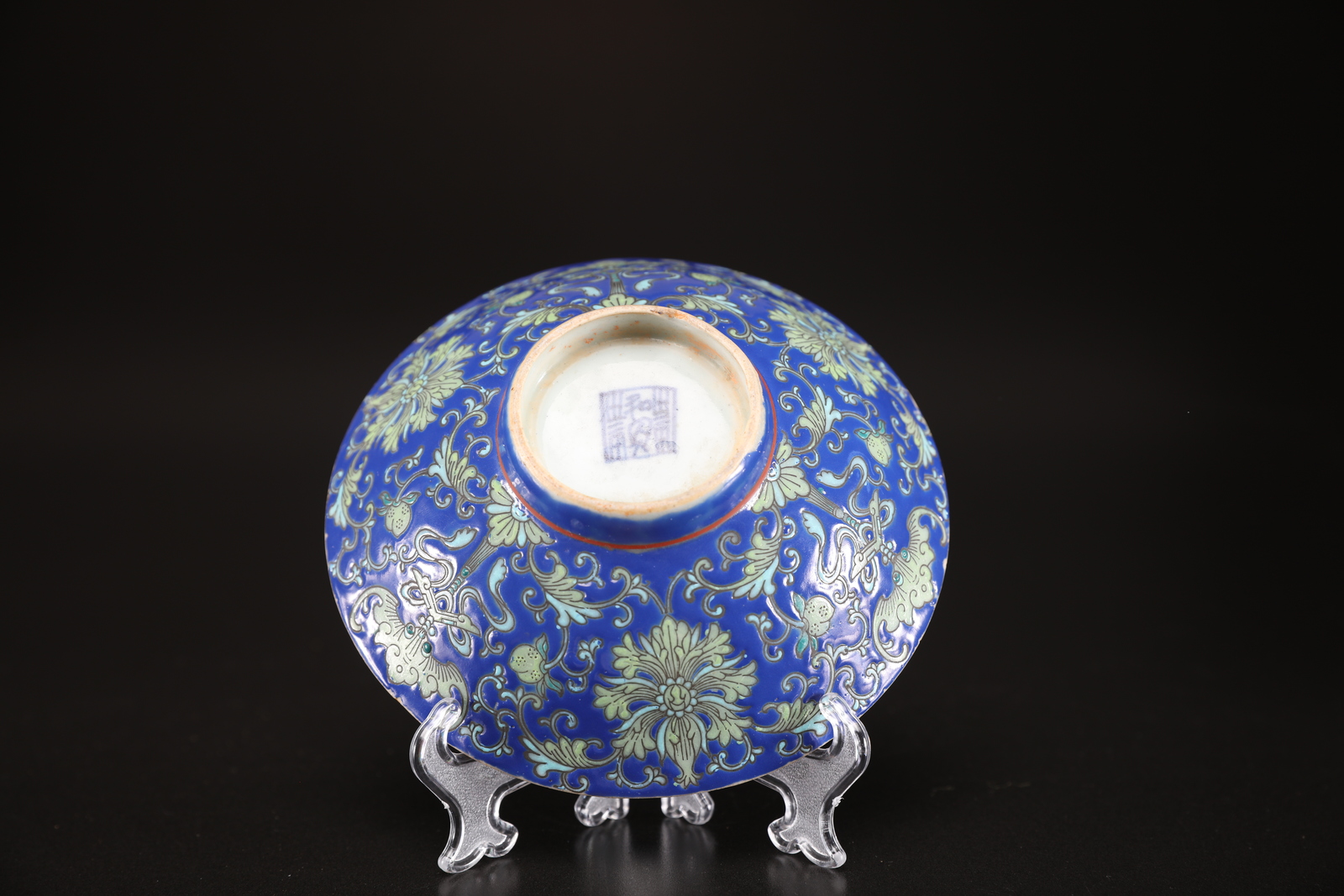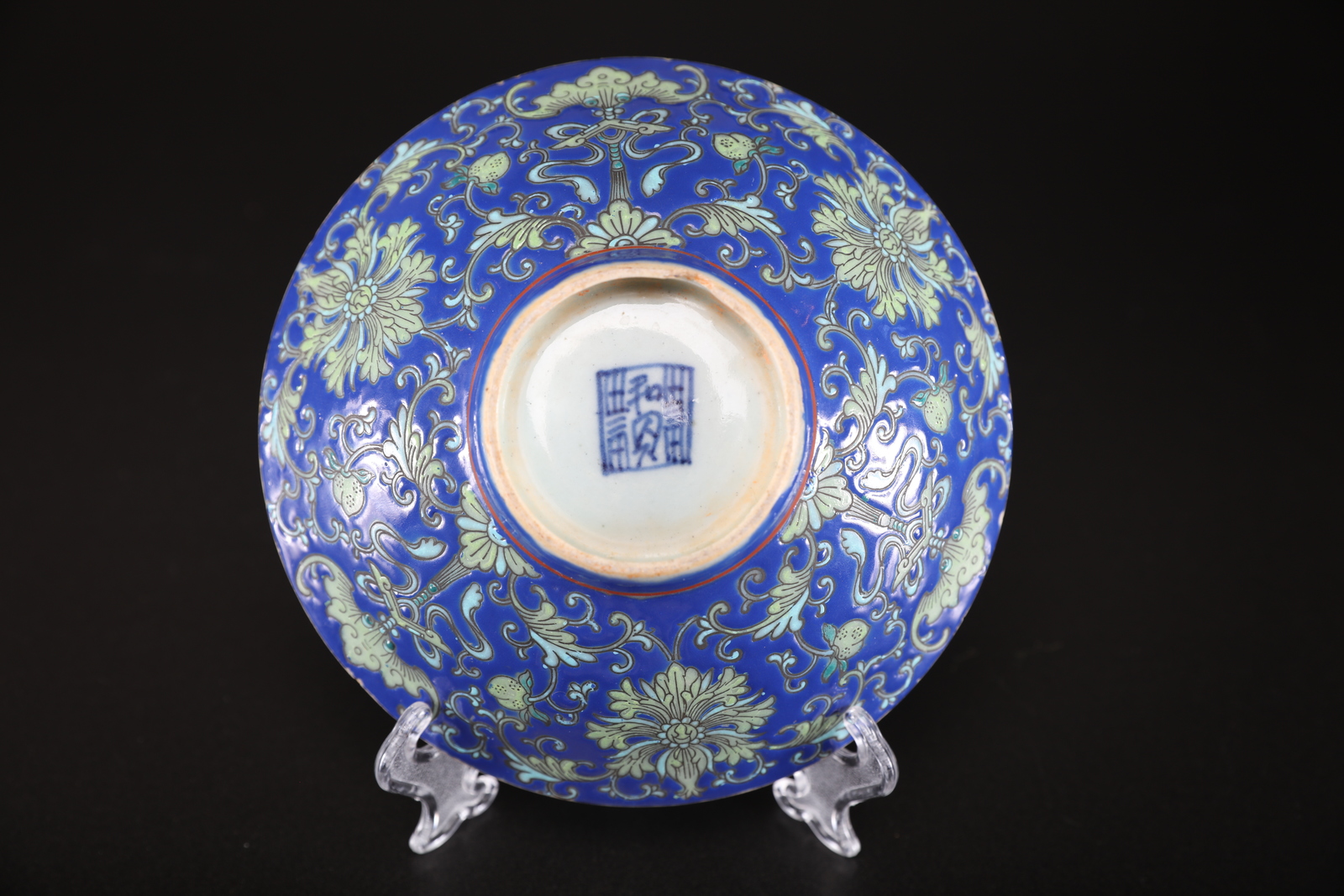 Arte Cinese An enamelled blue pottery bowl decorated with bats and peonies and bearing a mark