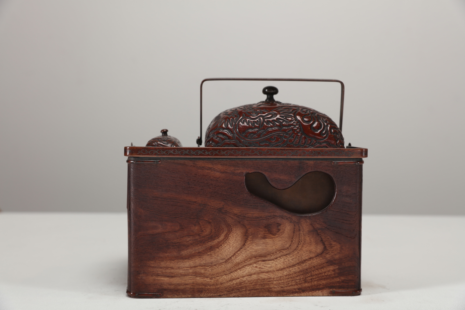 Giappone, XIX secolo. -. Cm 19,00 x 18,00. In radica con coperchio in rame sbalzato con dragoni e nuvole.