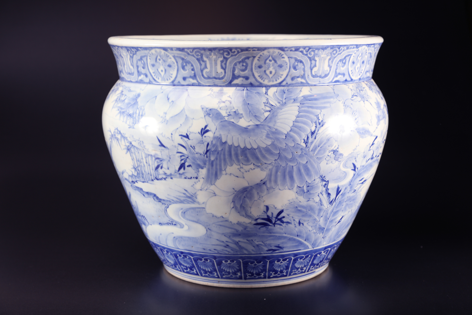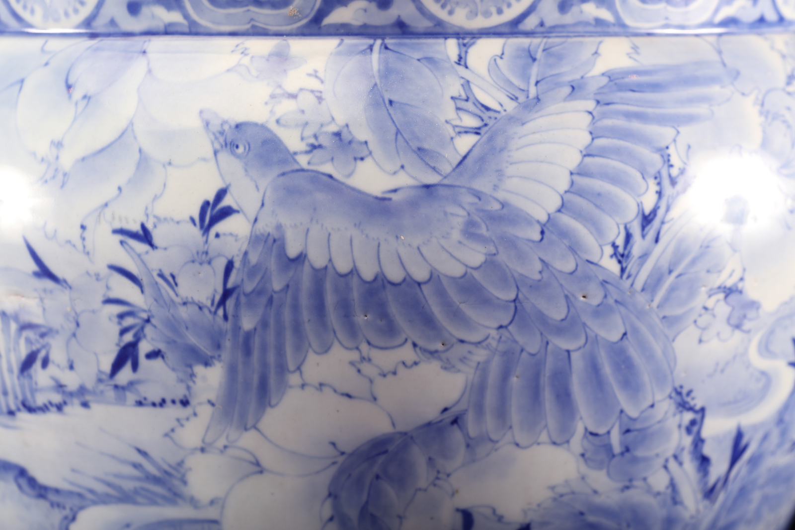 Arte Giapponese A massive blue and white porcelain jardinier painted with landscape with birds, blossoming branches and butterflies