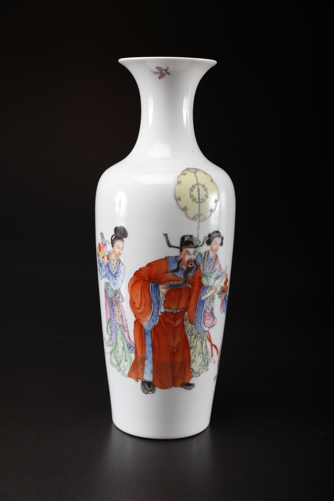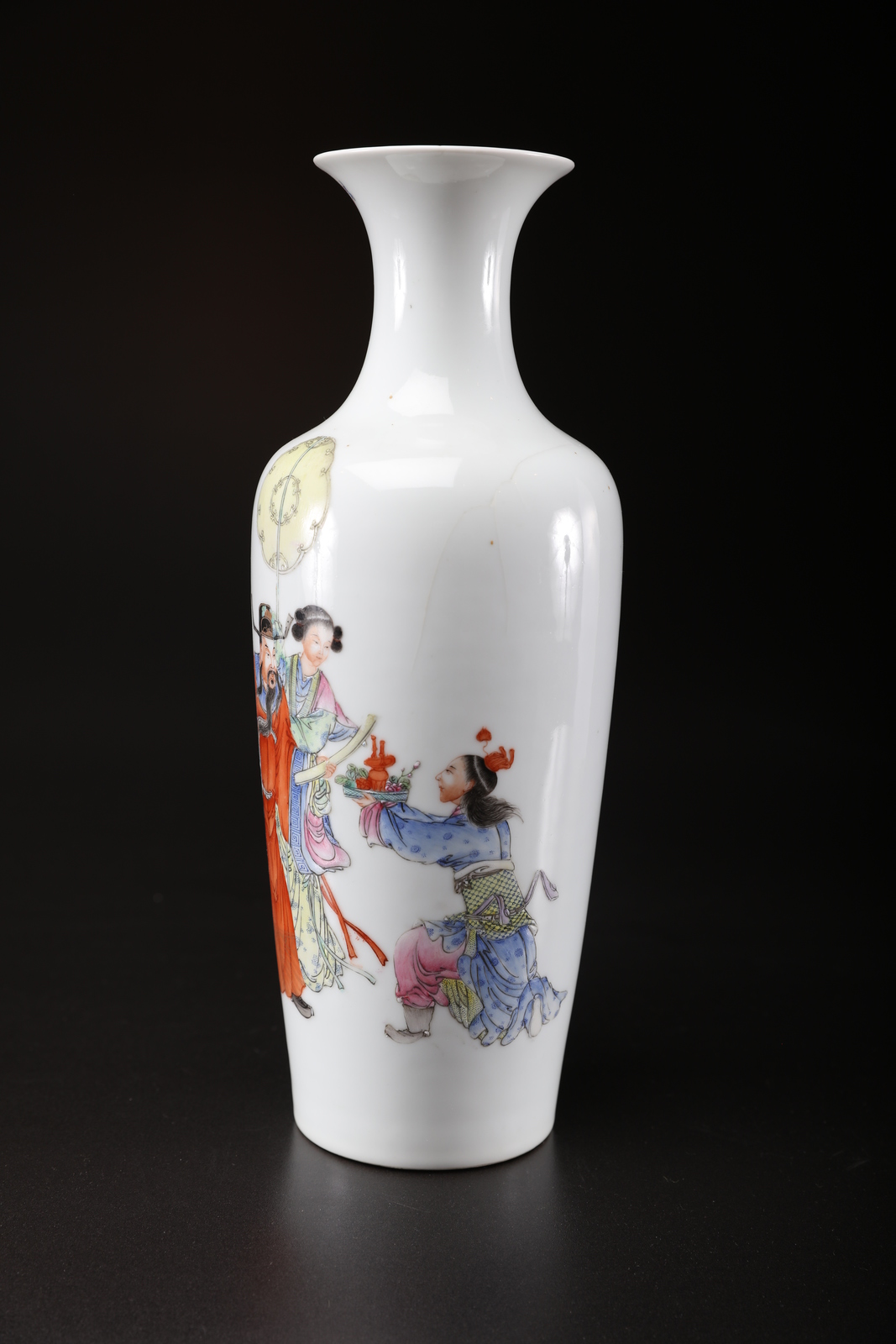 Arte Cinese A polychrome porcelain vase depicting a man offering flowers and antiques to a literate and bearing a six characters mark at the base