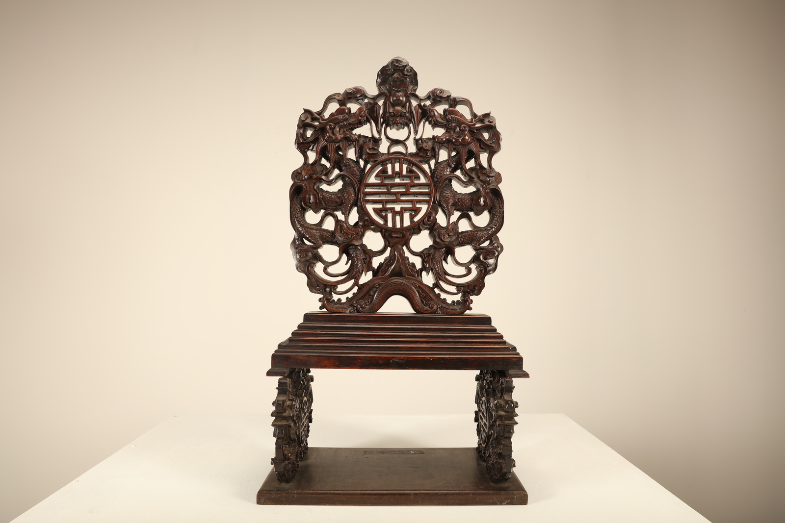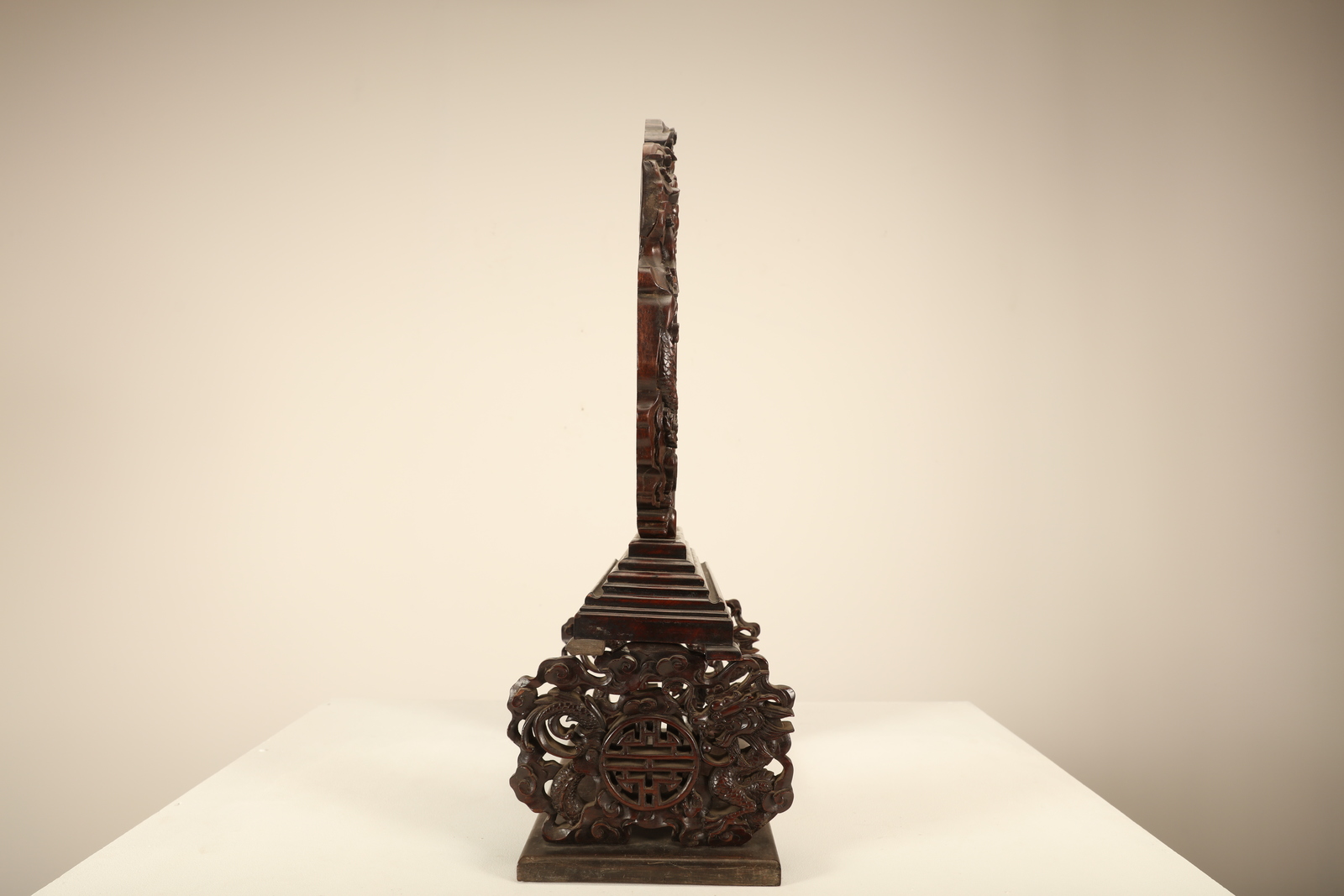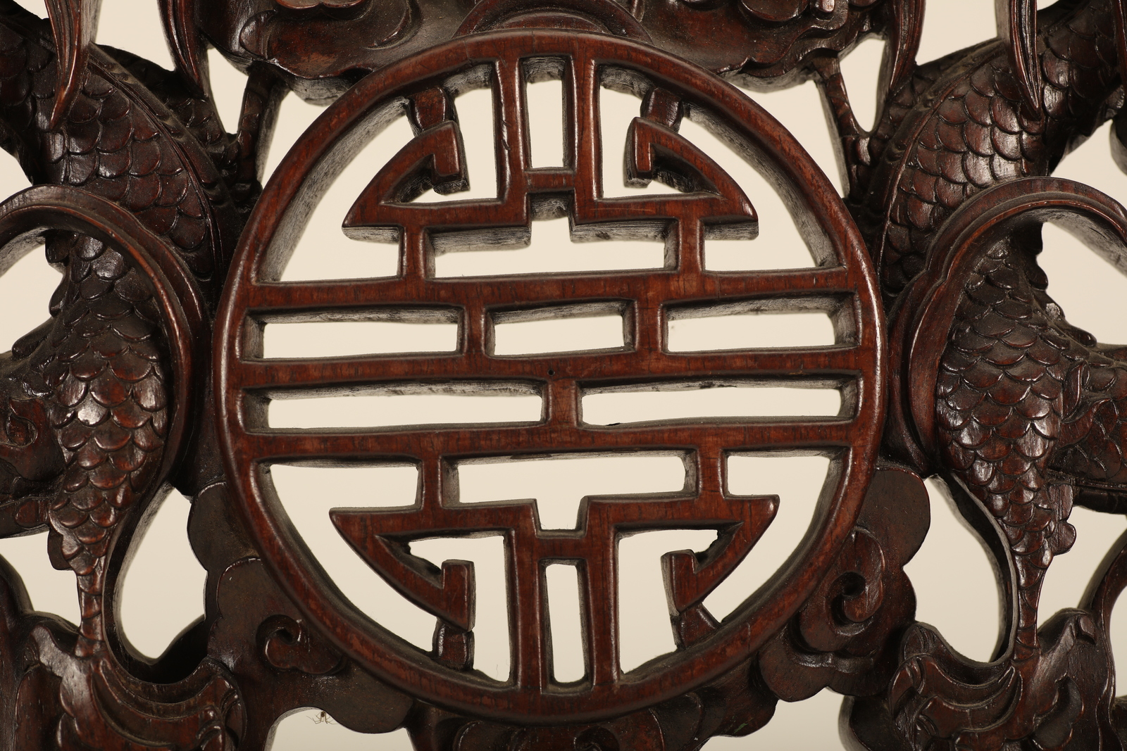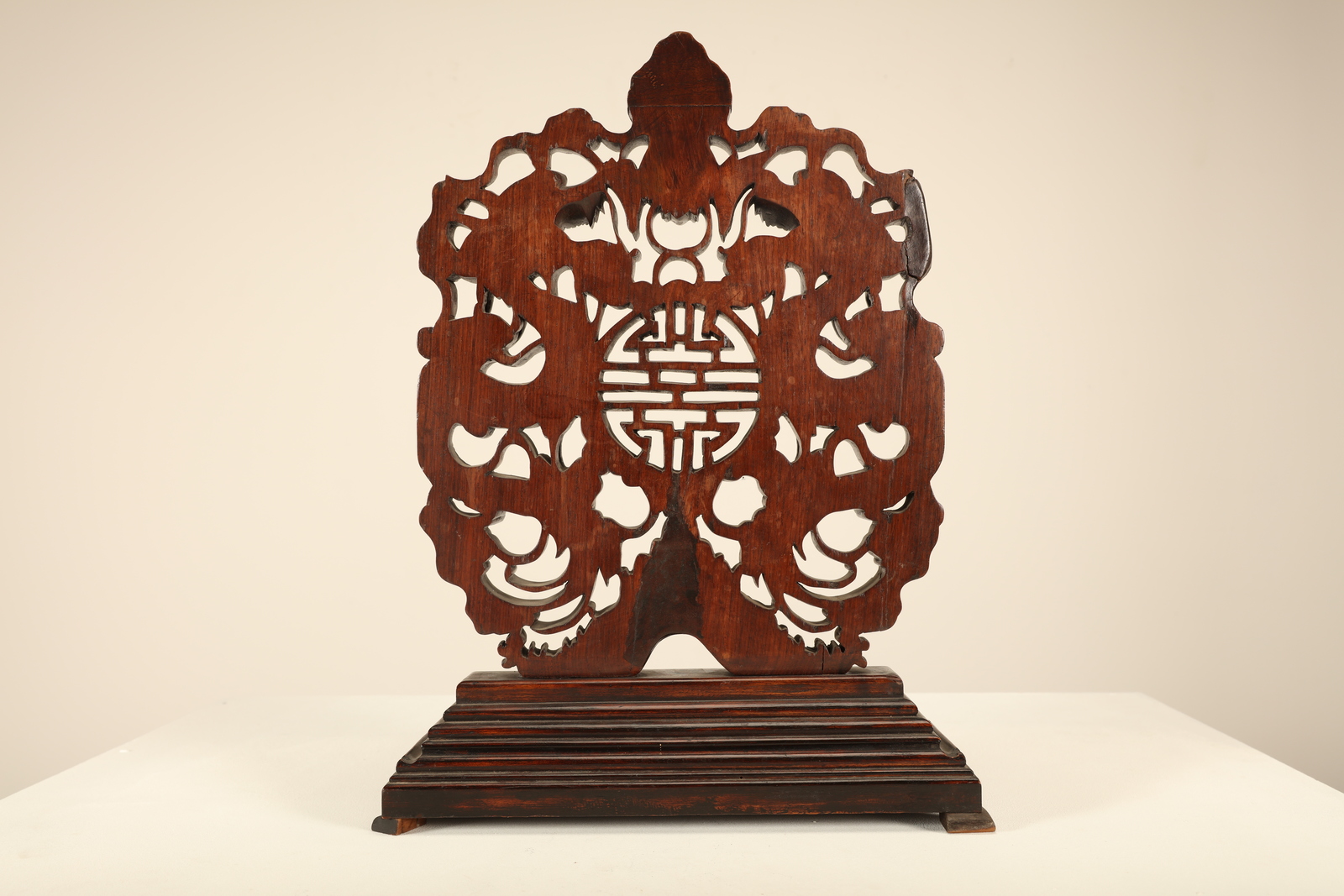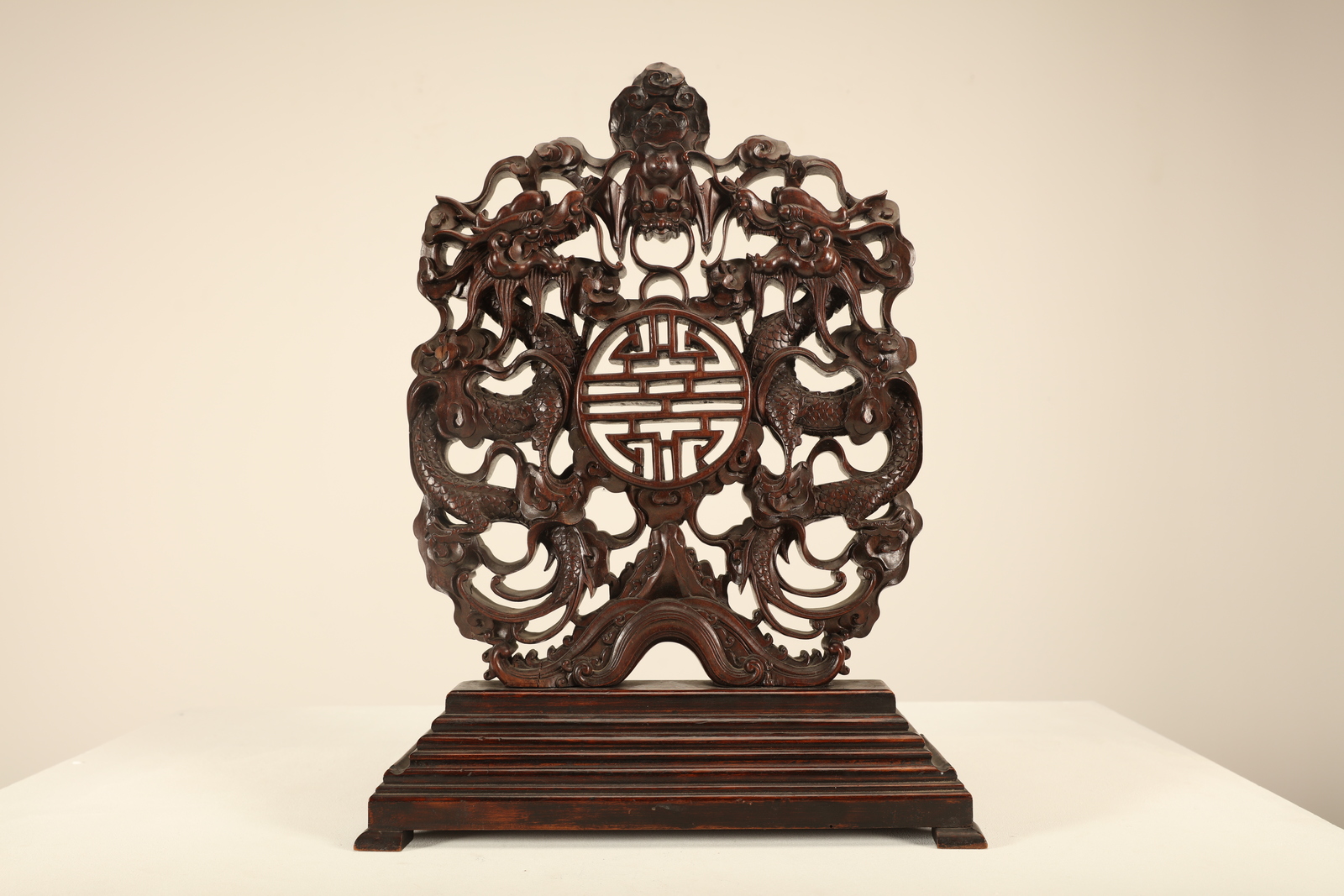 Arte Cinese A wooden tablescreen carved with a character, bats, dragons and clouds