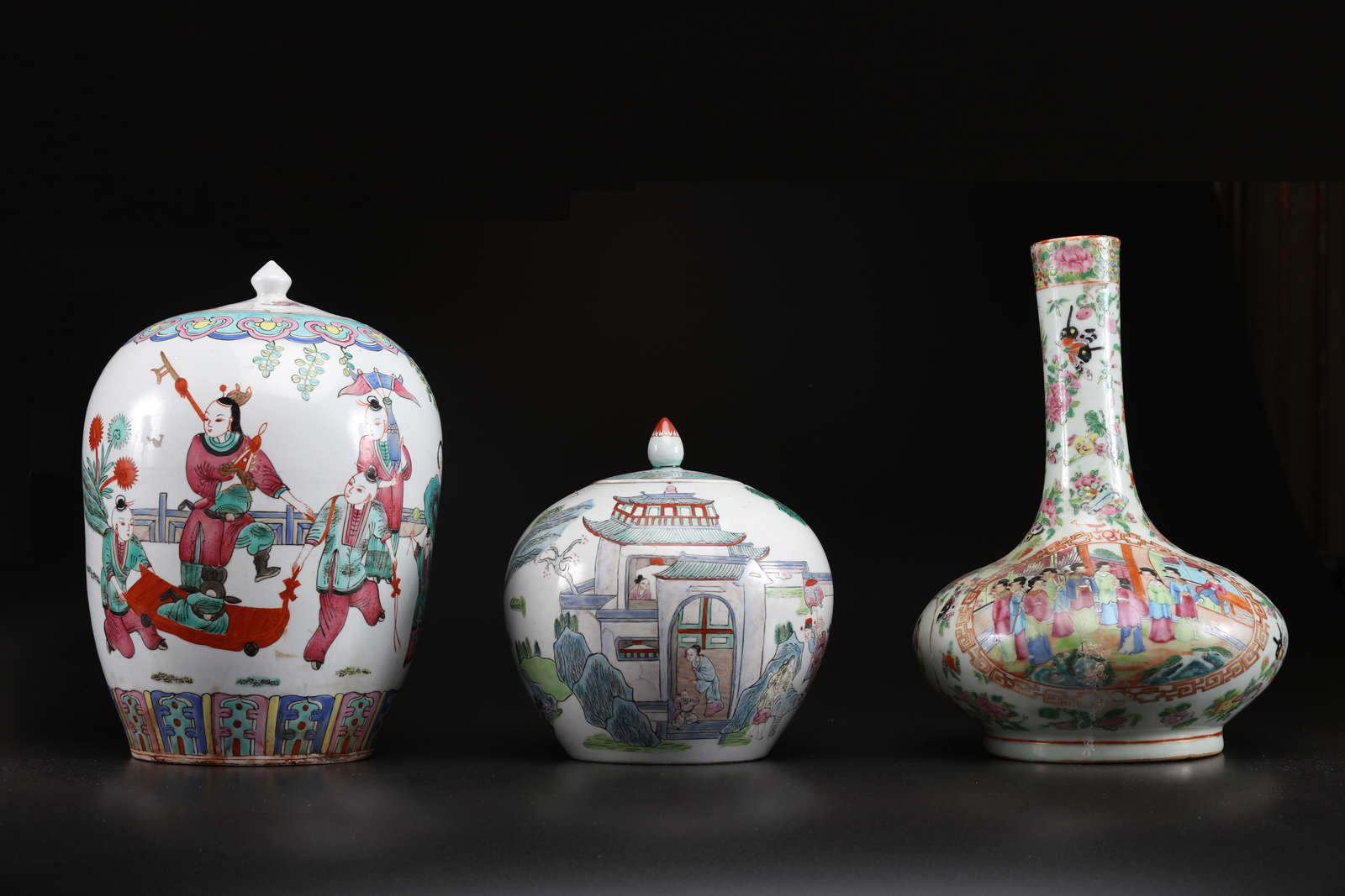 Arte Cinese Two famille verte potiches and a famille rose bottle vase