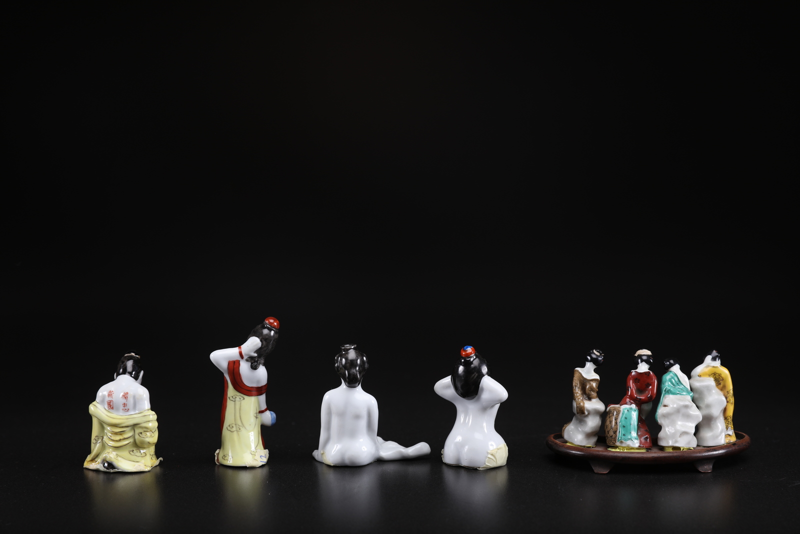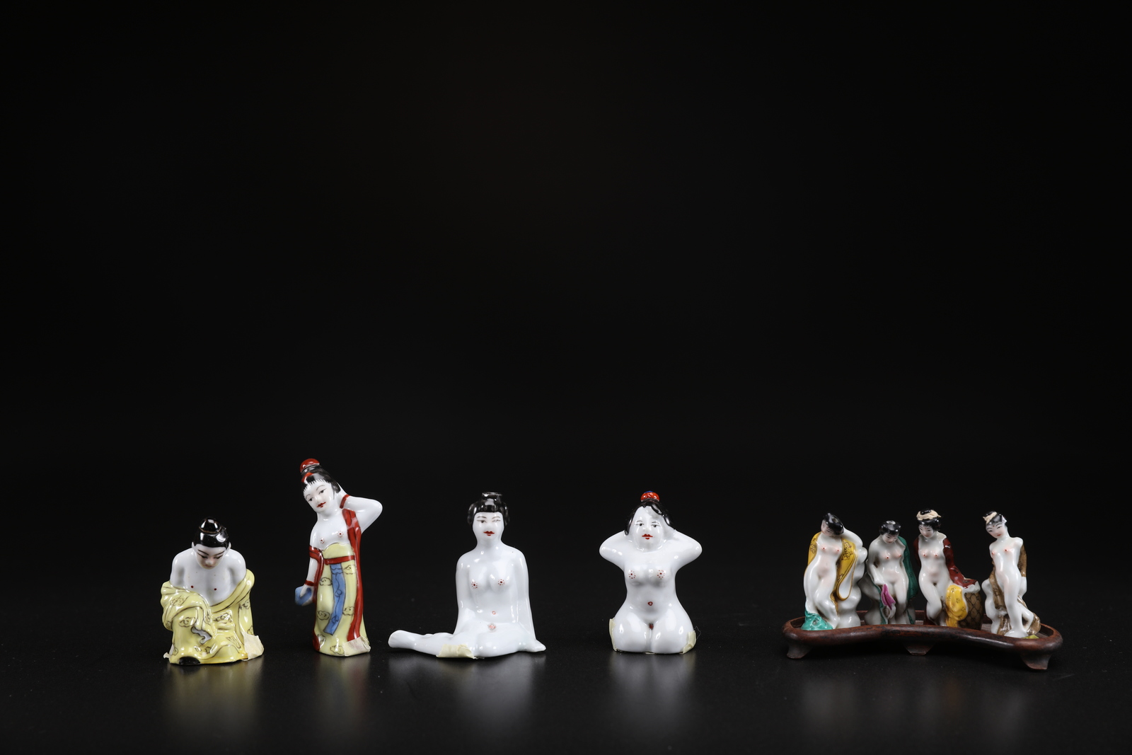 Arte Cinese Gruppo di otto tabacchiere in porcellana sagomate a figure femminili