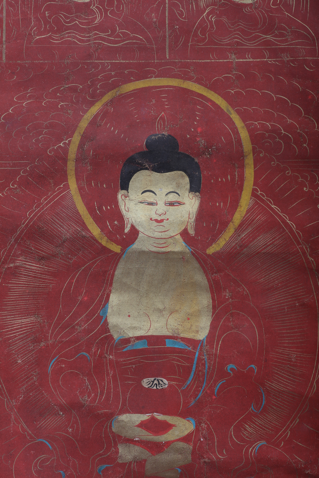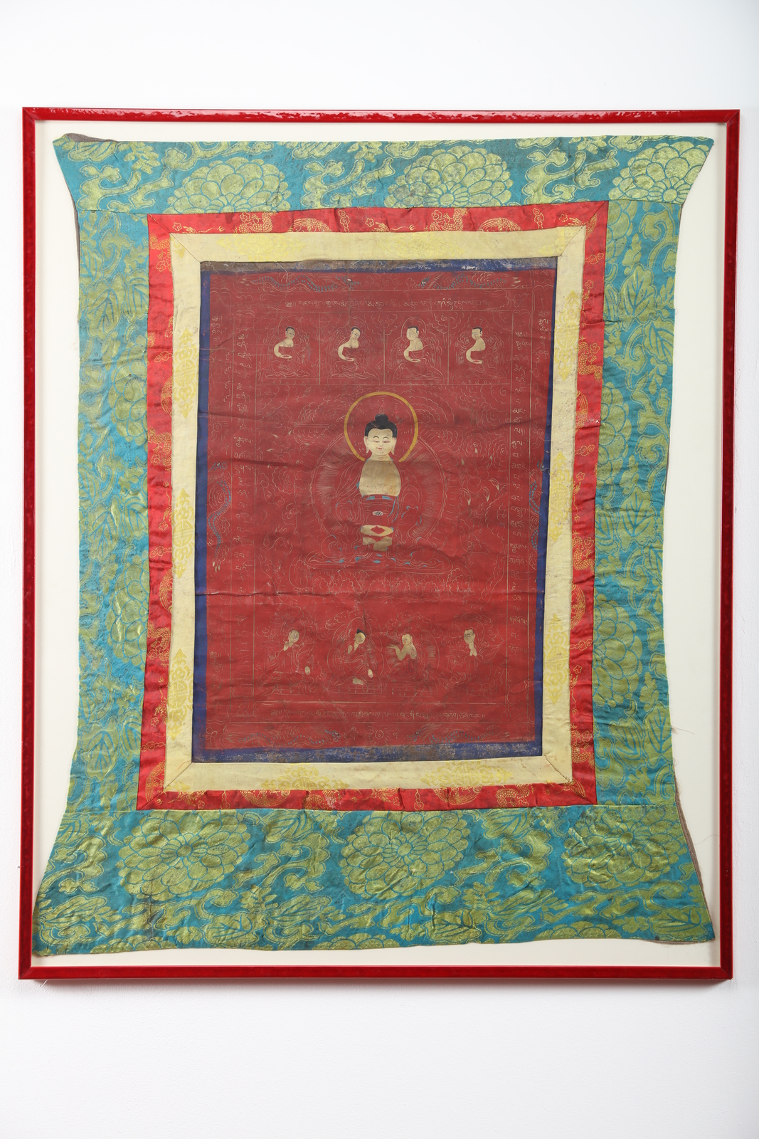 Arte Himalayana A red ground Msthl - thang thangka depicting Amitabha Nepal, 20th century . . Cm 83,70 x 101,40. Painting measurements: 58 X 41 cm