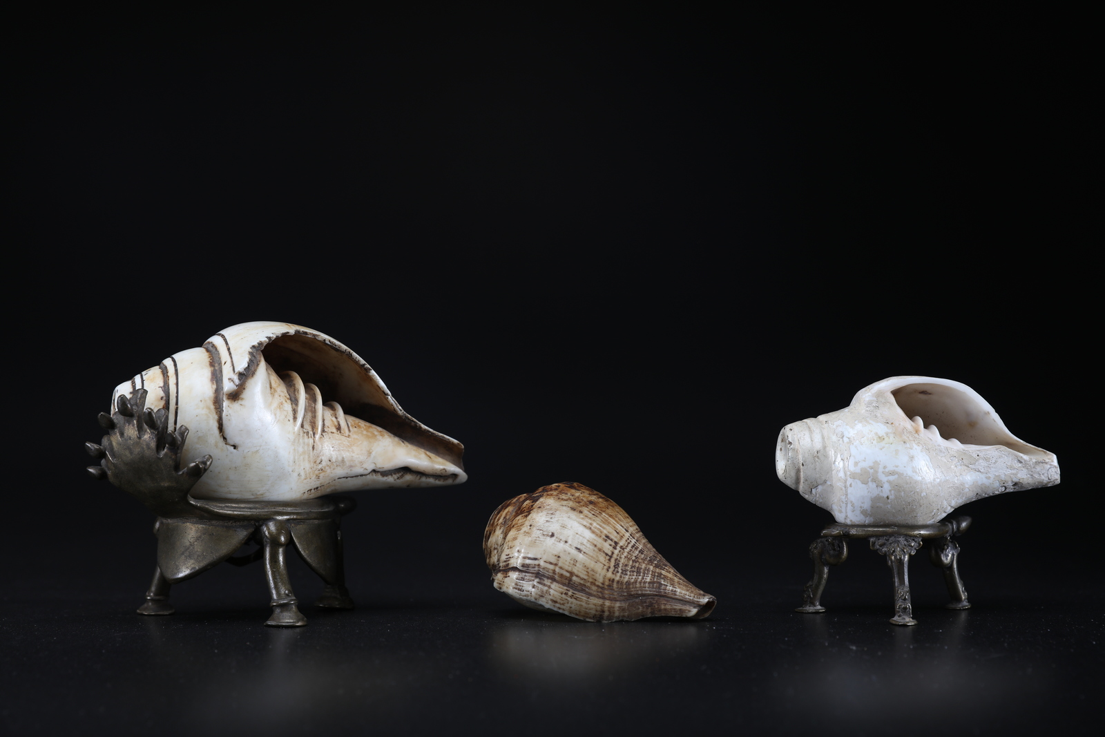 Arte Himalayana Lotto di tre conchiglie di cui due con base in bronzo