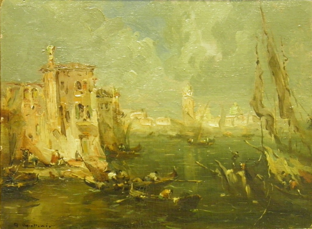 APOLLONIO GIOVANNI TREVISO 1879 TREVISO 1930 SCENA VENEZIANA, 1920 OLIO SU CARTONE TELATO cm 22 x 29 Firma in basso a sinstra Al retro etichetta Galleria Rotta (GE) Perizia a cura di Paolo Campopiano