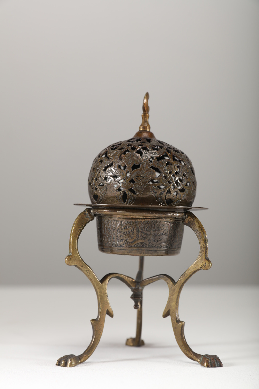 Arte Islamica Incensiere globulare in ottone lavorato a traforo e poggiante su tripode Turchia, XIX secolo. -. Cm 9,00 x 18,00.