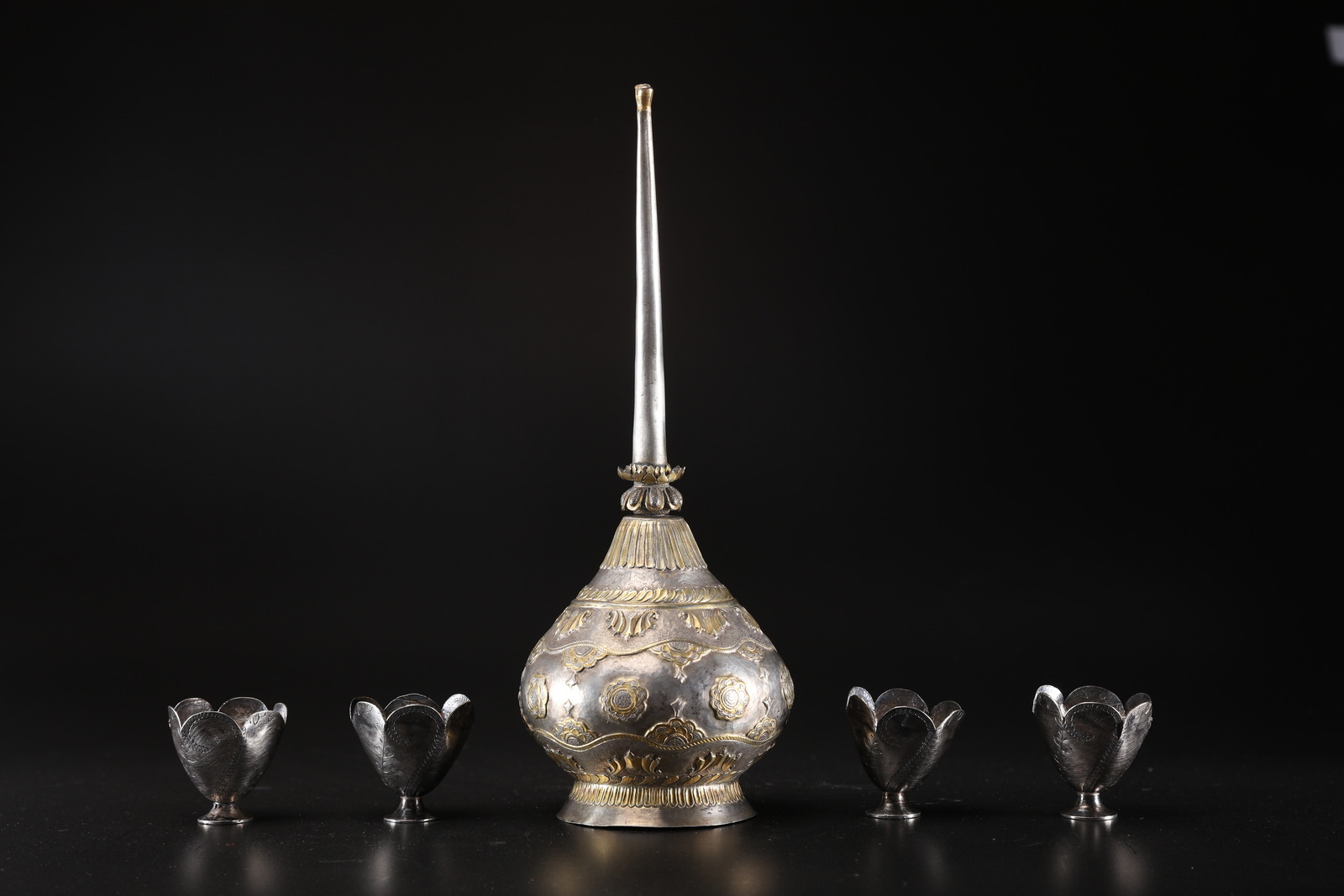 Arte Islamica Ampolla e bicchierini in argento Vicino Oriente, XIX secolo . . Cm 32,00. Lotto composto da una bottiglia in argento sbalzato e parzialmente dorato decorata con motivi floreali e mezze palmette (h. 32 cm) e quattro zarfs in argento terminanti con profili lobati e decorati con incisioni floreali e vegetali (h. 5,5 cm).