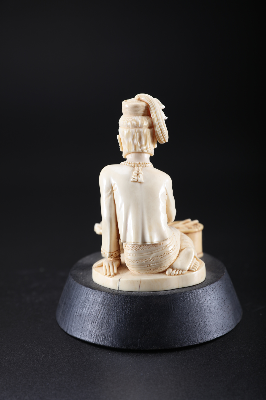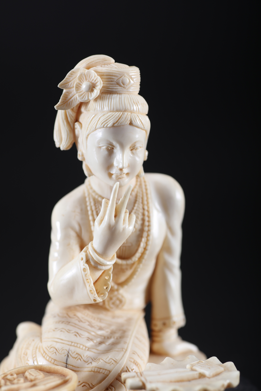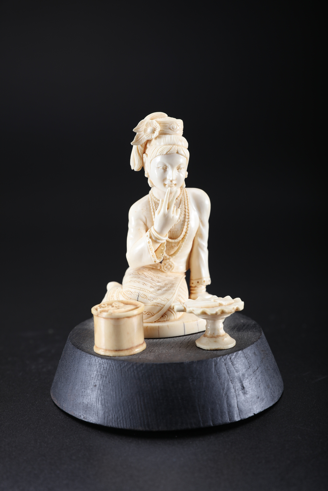 Arte Indiana An ivory carving depicting a seated lady on a wooden stand