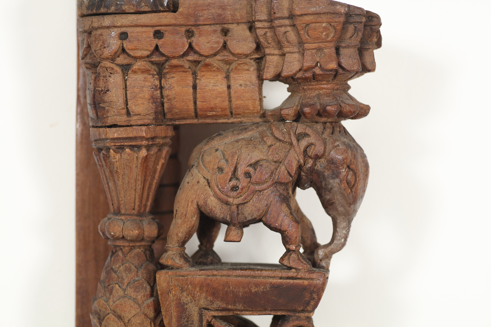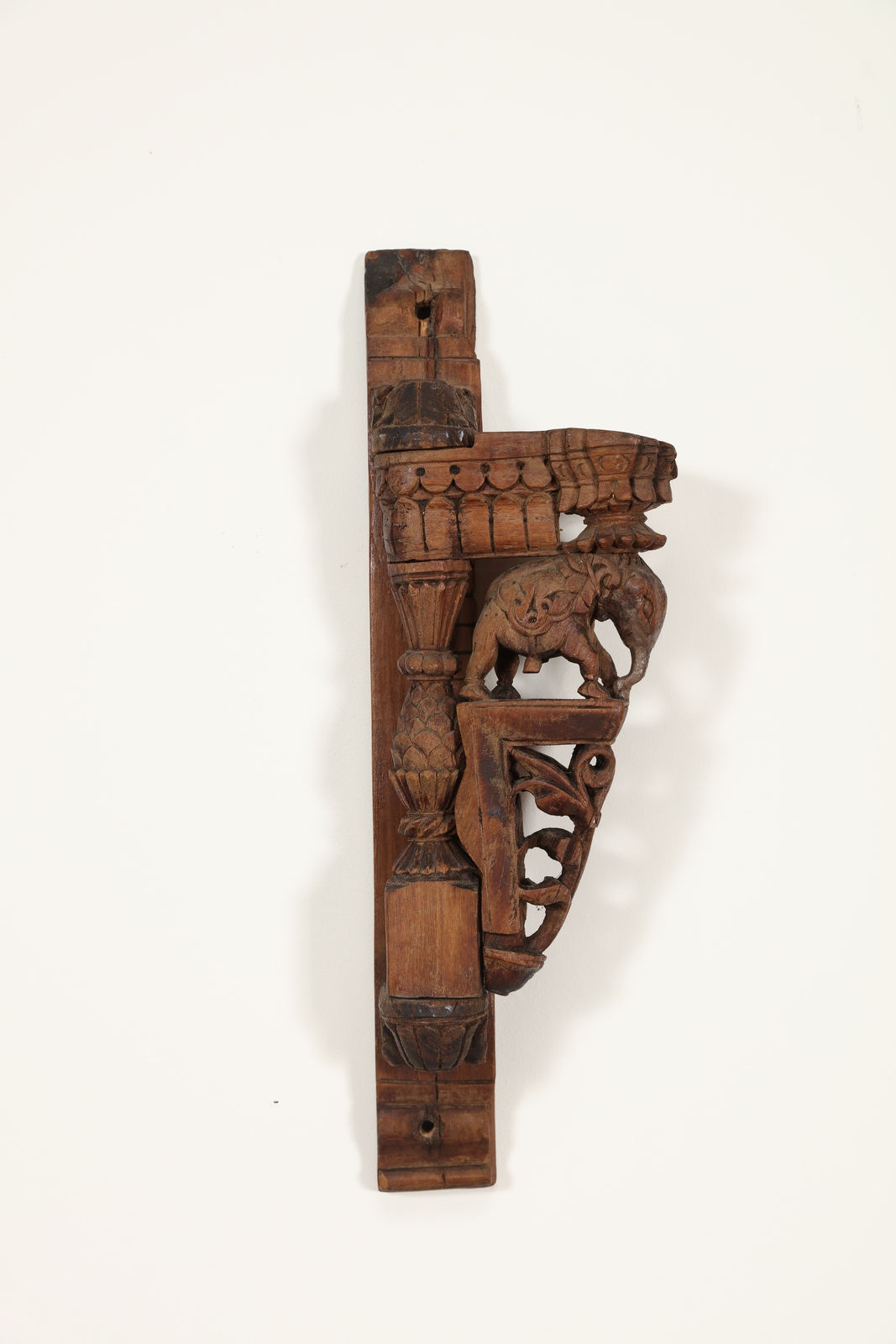 Arte Indiana A wooden bracket with vegetal motifs and an elephant on a rotating arm
