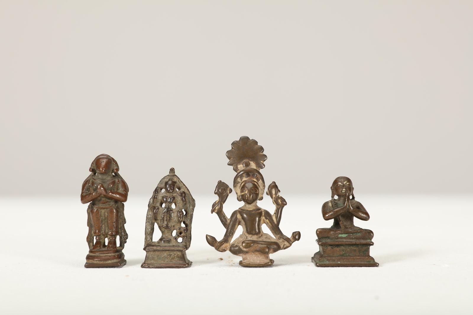 Arte Indiana Quattro bronzi devozionali raffiguranti un Orante, Vishnu e...