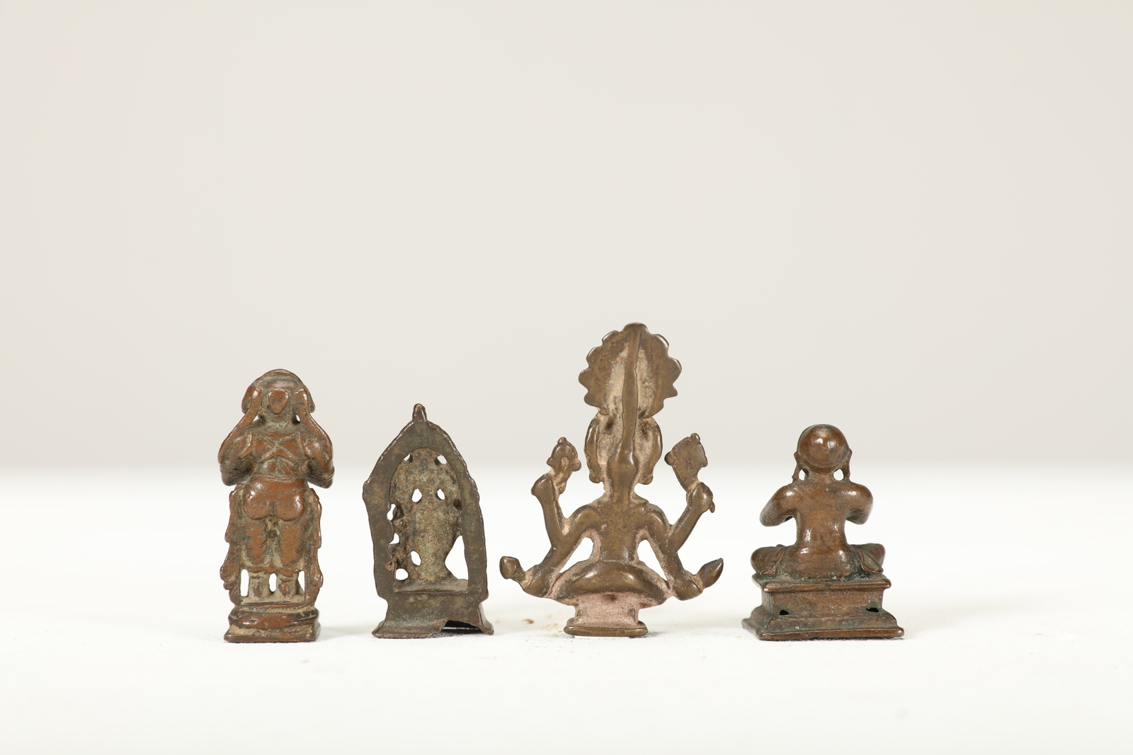 India, XVII-XVIII secolo. -. Cm 5,50. Vishnu con Prabha h 4 cm, Vishnu seduto h. 5,5 cm, Daksha h. 3,3 cm, Orante h. 4,6 cm