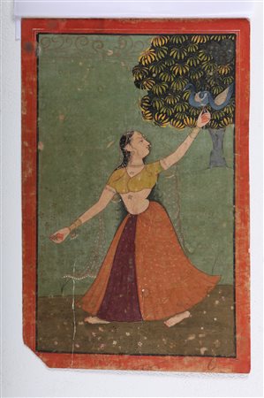 Arte Indiana Miniatura raffigurante una donna che ciba due pavoni appollaiati su un albero