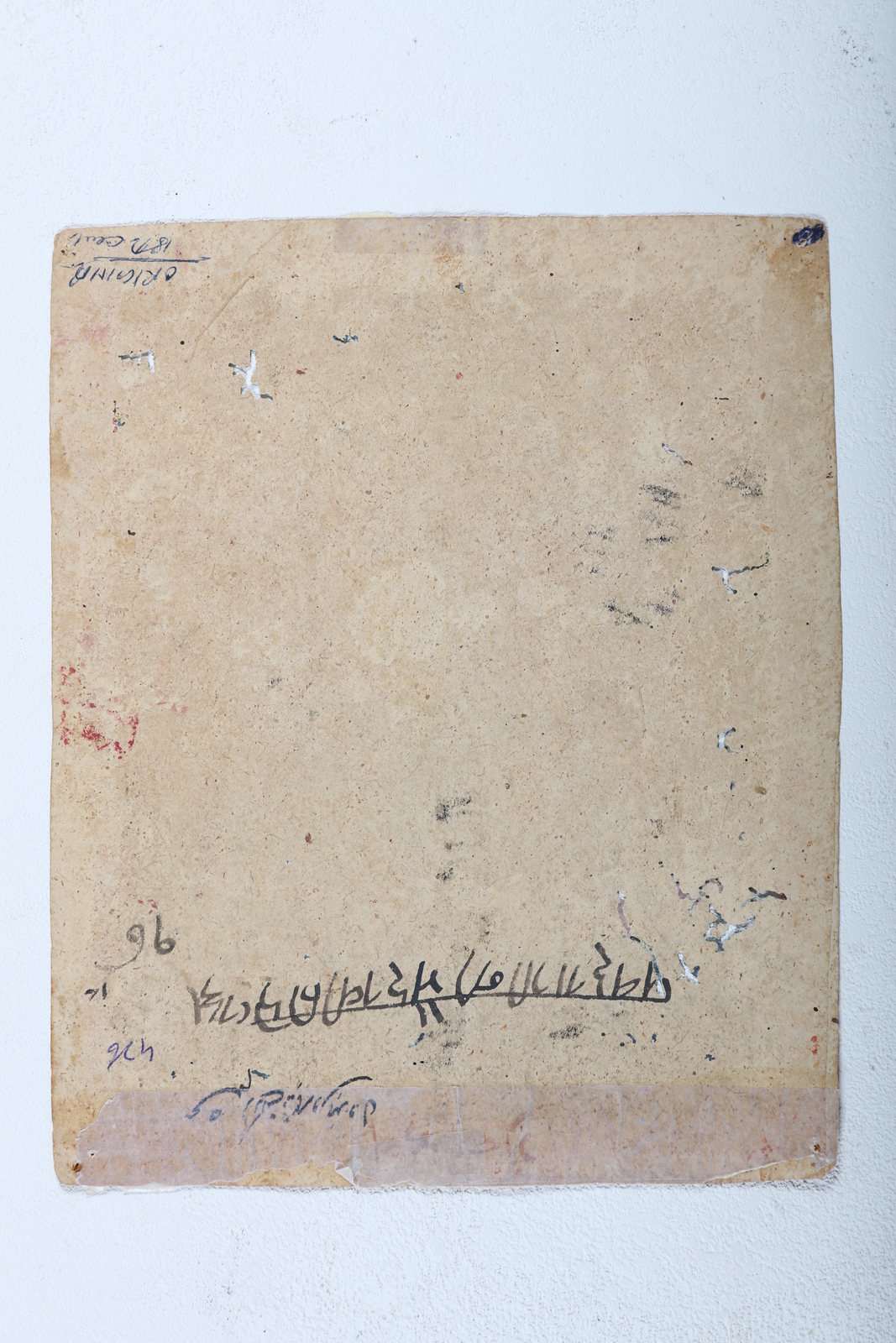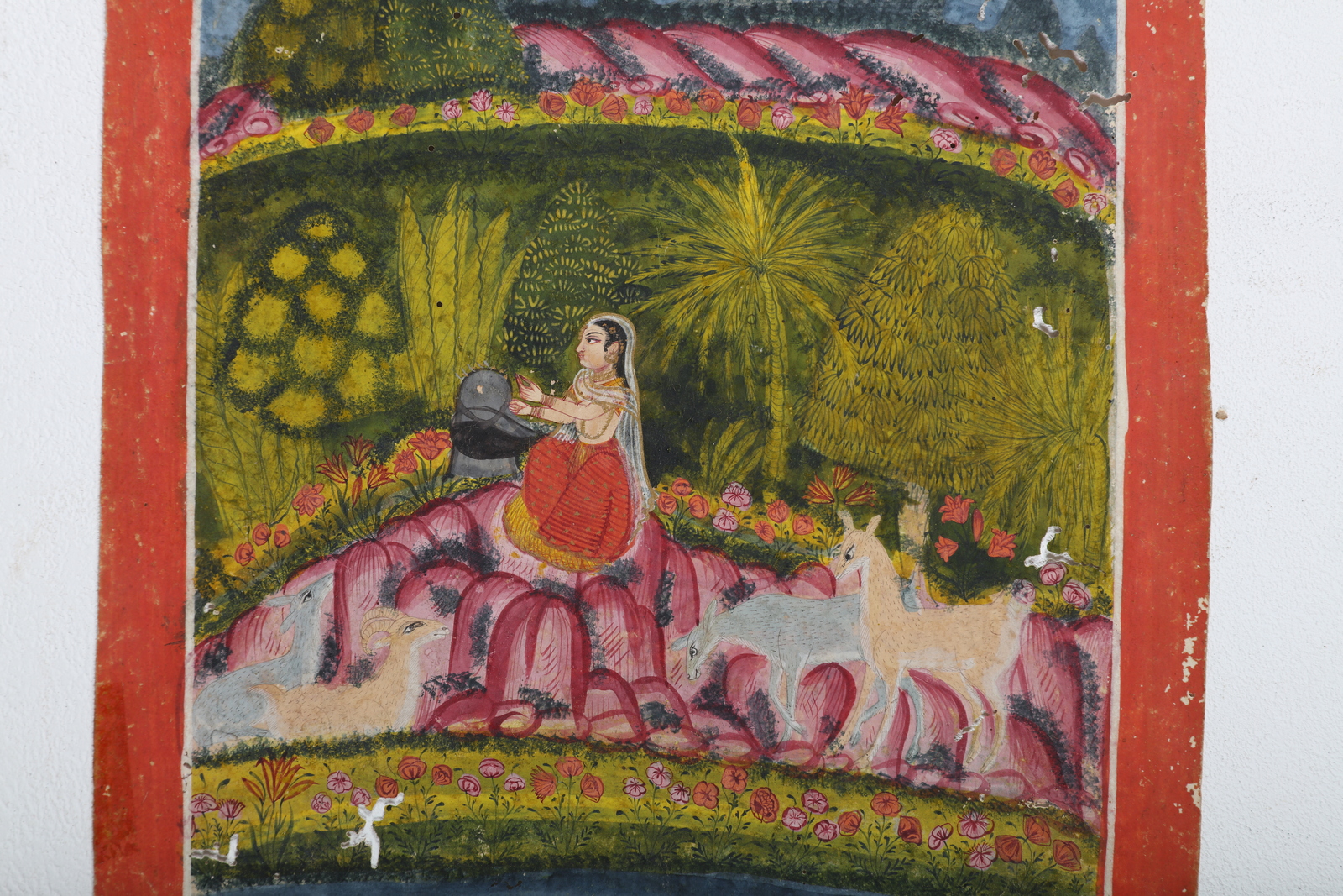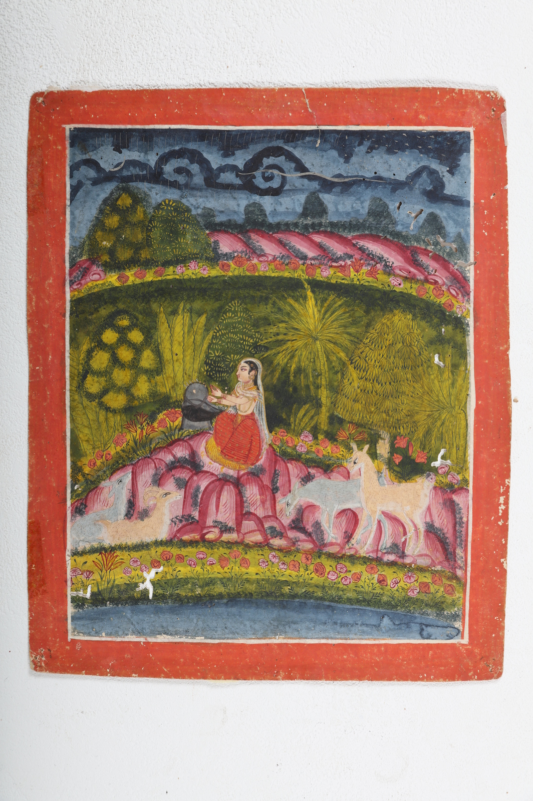 Colori naturali e oro su carta . -. Cm 18,50 x 23,00. Entro cornice rossa, il dipinto raffigura una devota di Shiva che venera la forma aniconica della divinità, il linga. Il soggetto è inserito in un paesaggio verdeggiante caratterizzato da due cervi e dal cielo monsonico. Questo dipinto e quello al lotto precedente sono parte della stessa serie.