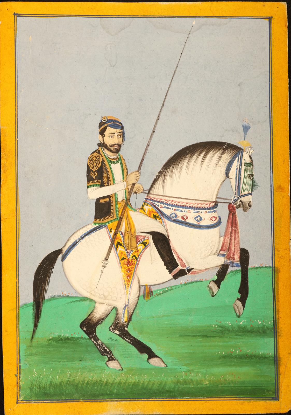 Arte Indiana Ritratto equestre India, Jaipur, inizio XX secolo. -. Cm 24,00 x 16,50. Miniatura ritraente Sawai Ram Singh II, maharaja di Jaipur dal 1922 al 1948. La caratterizzazione del volto risulta essere tipicamente fotografica mentre l'ambientazione e l'impianto compositivo sono specifici della tradizione rajasthana. Ritratti di questo tipo sono entrati a far parte del repertorio stilistico delle miniature Rajput solo dal XVII secolo, in quanto usanza mutuata dalla corte Mogul.
