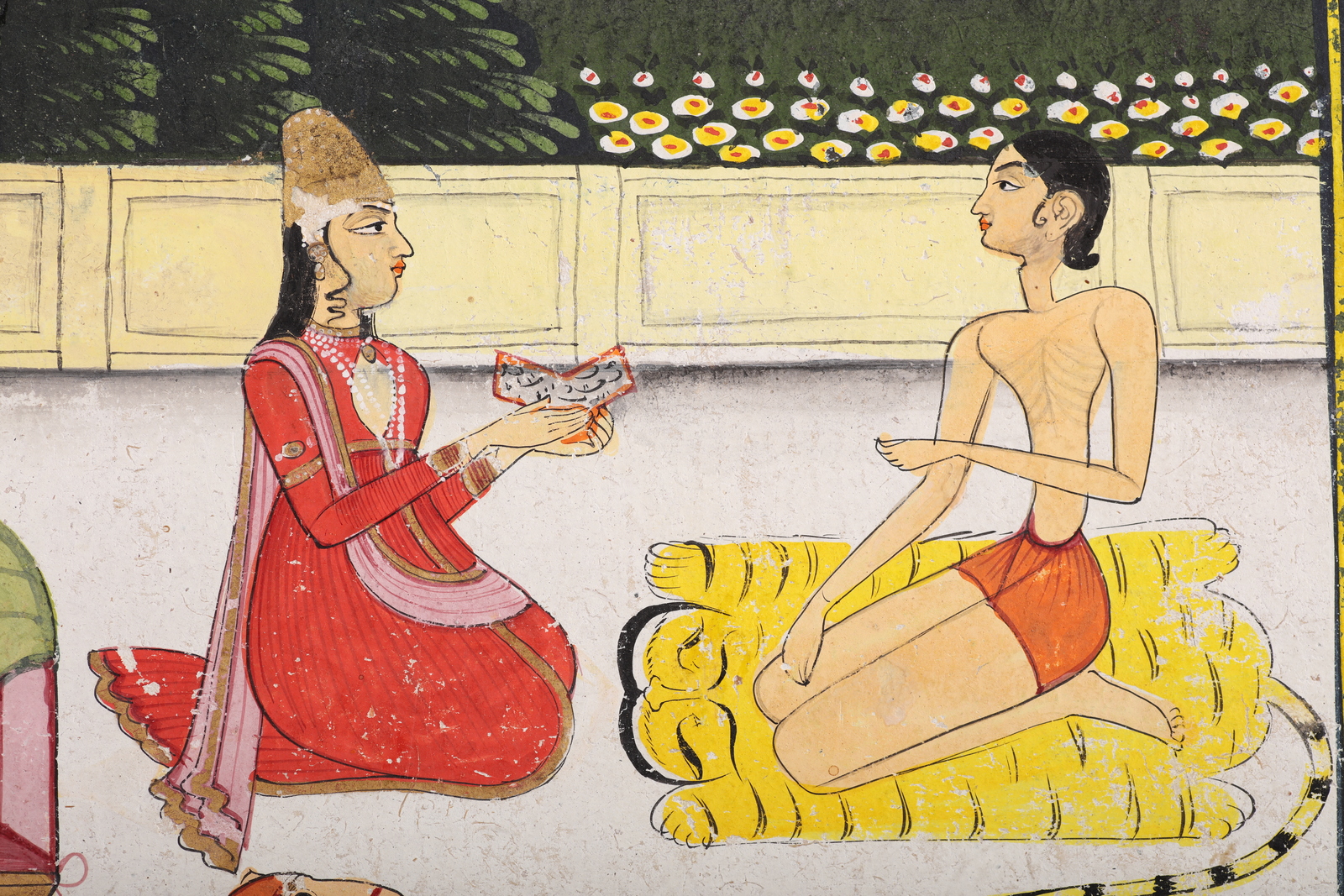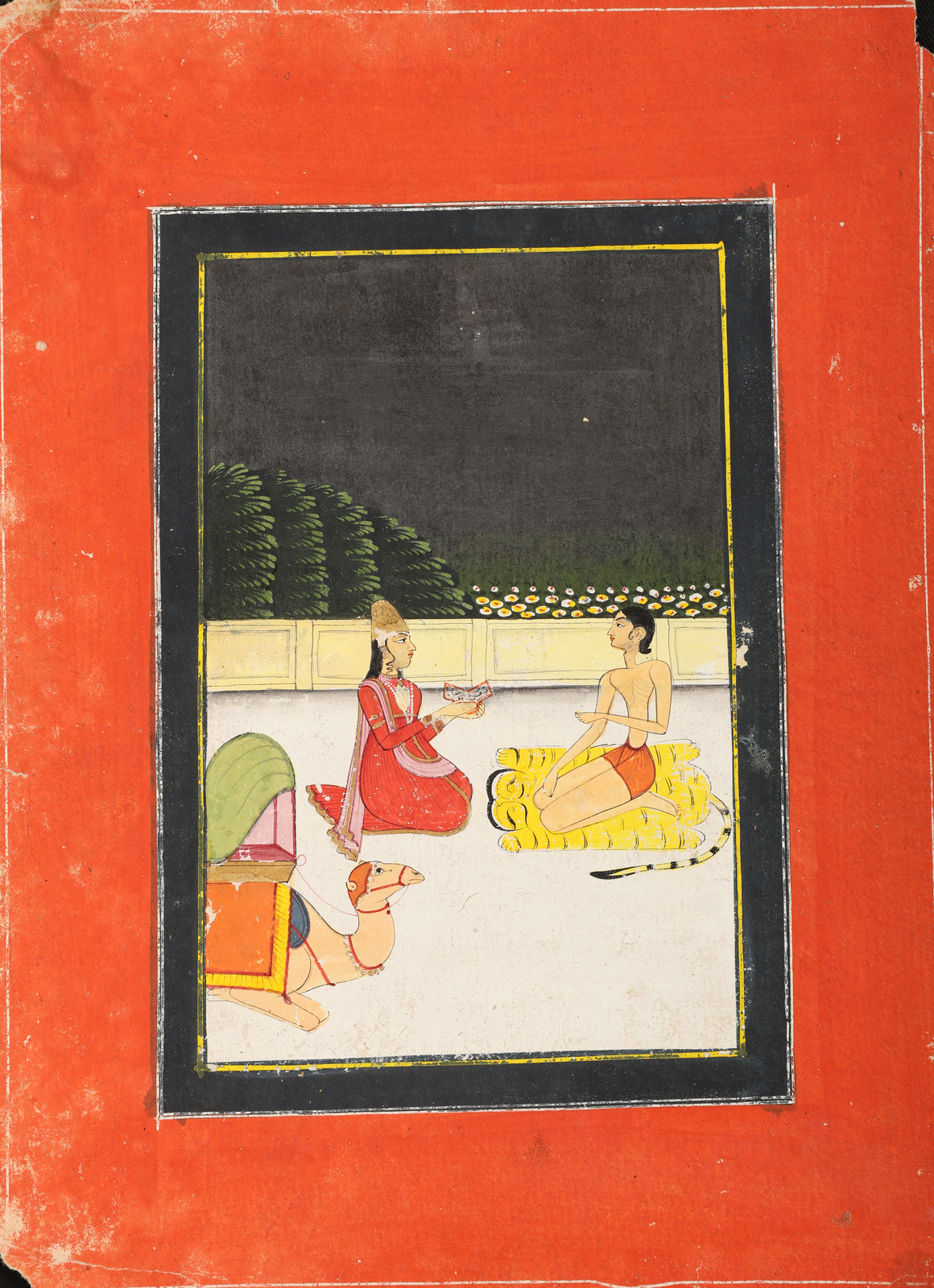 Arte Indiana Miniatura raffigurante un passaggio del Ragamala India, Rajasthan orientale, forse Biikaner, fine XVIII - inizio XIX secolo. -. Cm 20,00 x 27,50. Raffigurante una donna che offre doni ad un asceta emaciato seduto su una pelle di tigre.