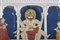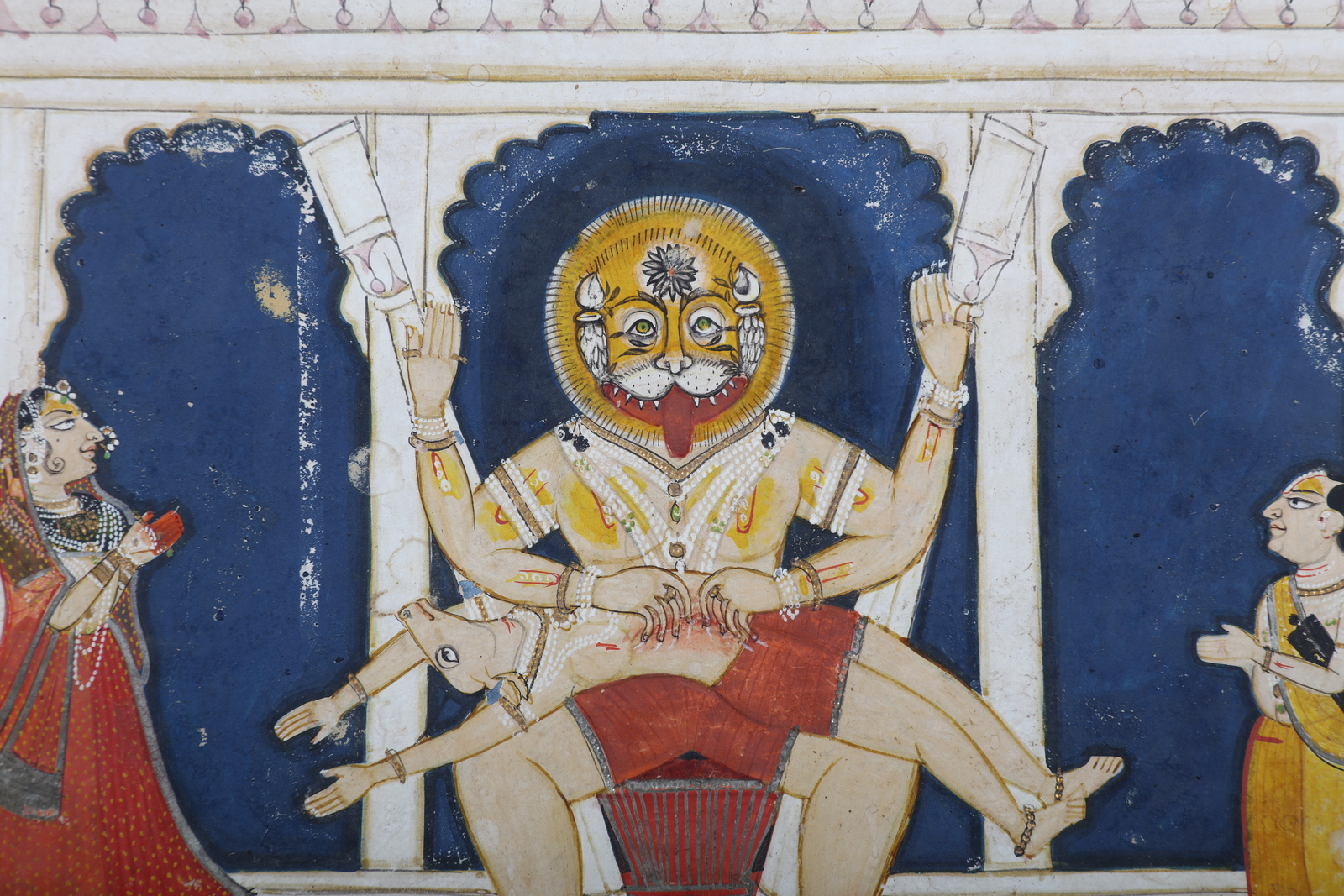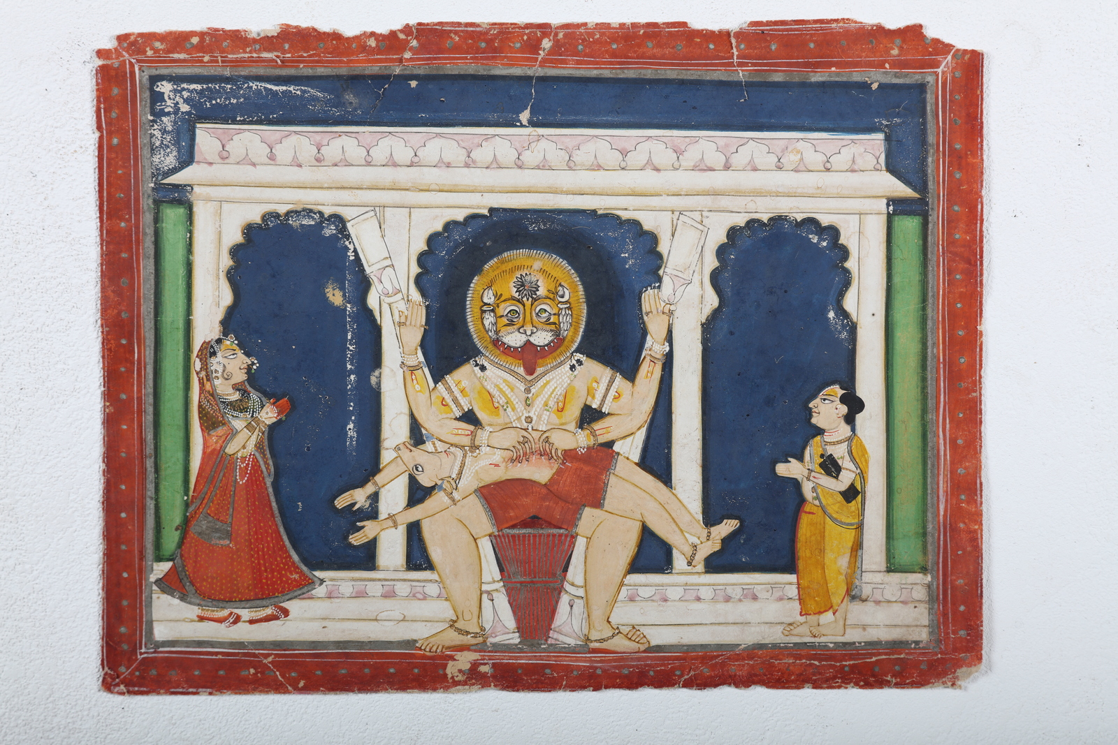 Pigmenti naturali e oro su carta . -. Cm 23,00 x 17,00. Un'architettura bianca caratterizzata da tre archi lobati inquadra i tre personaggi: due attendenti ai lati e Narasimha, avatar di Vishnu per metà uomo e per metà leone, raffigurato in posizione centrale mentre con gli artigli squarta il ventre del demone.