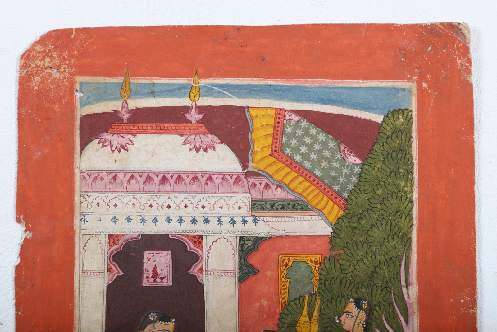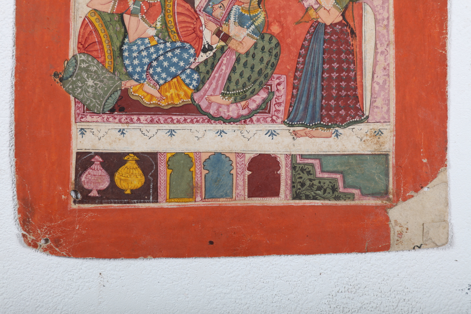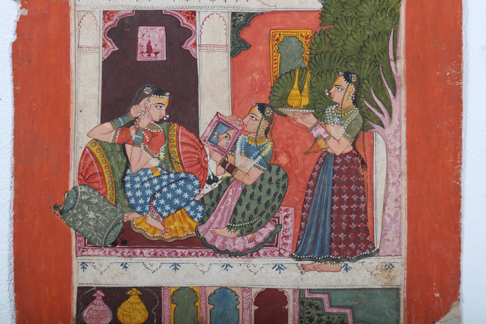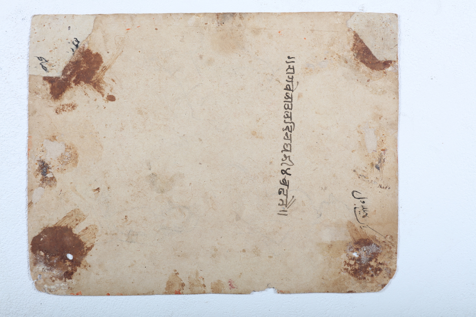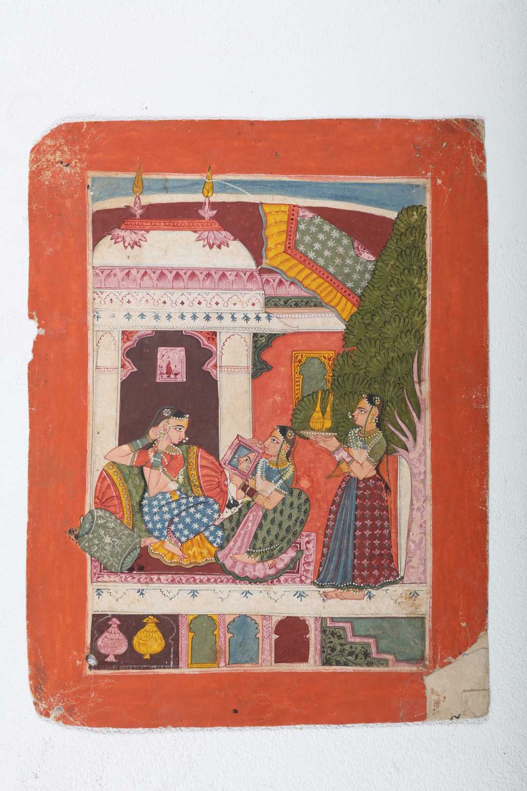 Arte Indiana Vilaval Ragini Importante miniatura tratta da un Ragamala India, Rajasthan Sud Occidentale, scuola di Sirohi, 1680 ca. . -. Cm 16,50 x 22,20. Il Ragamala è una serie di dipinti raffiguranti modi musicali e rappresenta uno dei temi più cari alla tradizione indiana, specialmente Rajasthana. Ogni serie è composta da 36 o più raramente 42 dipinti generalmente raccolti in famiglie di sei contenenti un raga (maschile) e cinque raginis (mogli). Data la complessità della struttura, serie complete sono difficilmente reperibili, ma ancor più rara è la rintracciabilità di Ragamala afferenti alla scuola di Sirohi di cui al momento si conoscono solo una serie completa di trentasei dipinti ed una di tredici conservate presso la collezione K. Sangram Singh di Nawalgarh, diversi dipinti singoli sparsi in collezioni pubbliche e private ed una serie di tredici recentemente emersa all'attenzione degli studiosi da cui provengono i due esemplari qui proposti (lotto corrente e successivo). La scuola pittorica di Sirohi fu attiva per circa due secoli, XVII - XVIII, ma il periodo più fecondo per le Ragamala fu l'ultimo quarto del XVII secolo, periodo al quale sono ascrivibili tutti gli esemplari conosciuti. Il consenso generale ritiene che il carattere distintivo di questa scuola risieda nella vivacità dei colori e, soprattutto per quel che concerne le Ragamala, nell'interpretazione in chiave locale dei temi e dell'iconografia classica rajasthana, tratti che identificano la scuola di Sirohi come un unicum all'interno della scuole pittoriche Rajput.