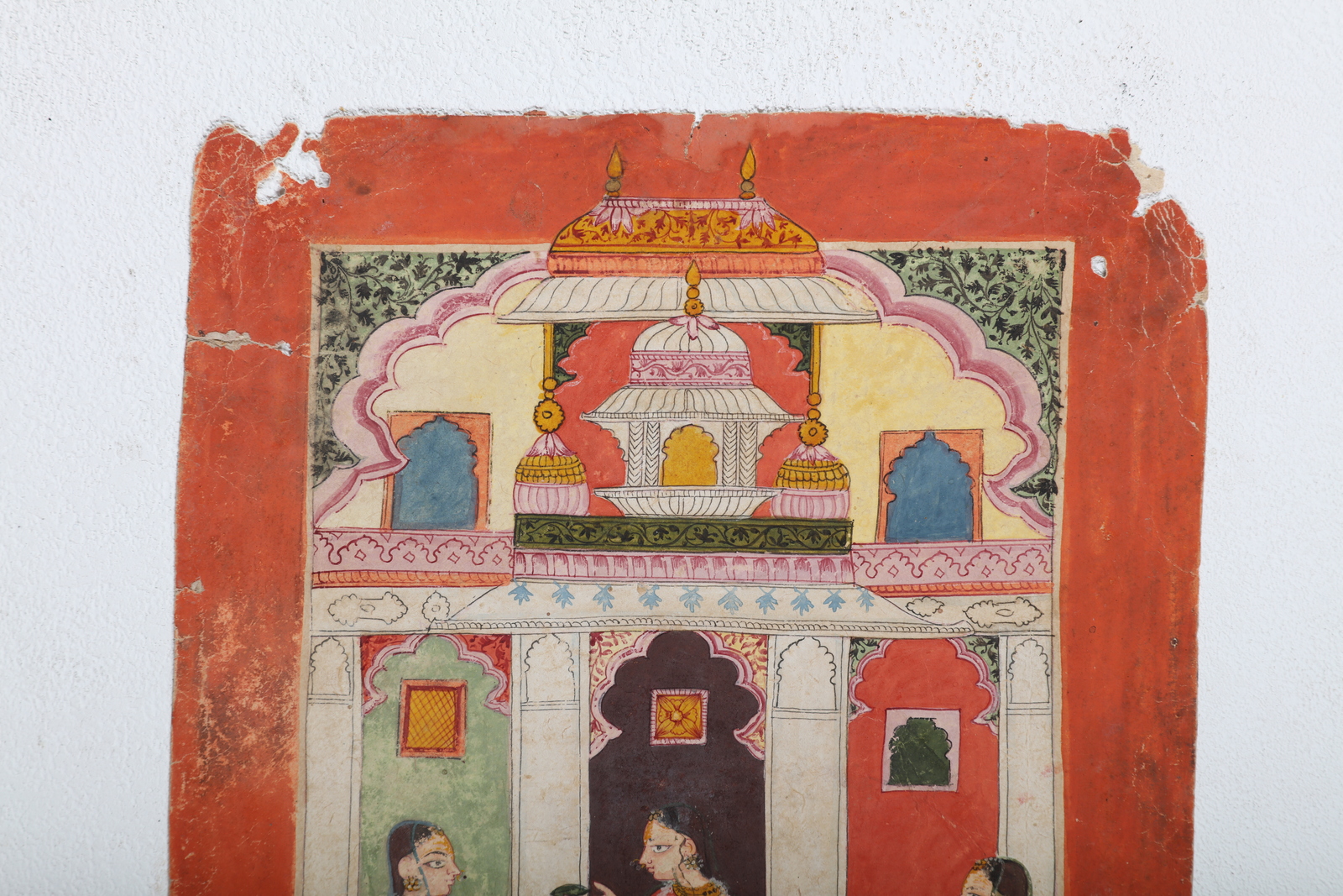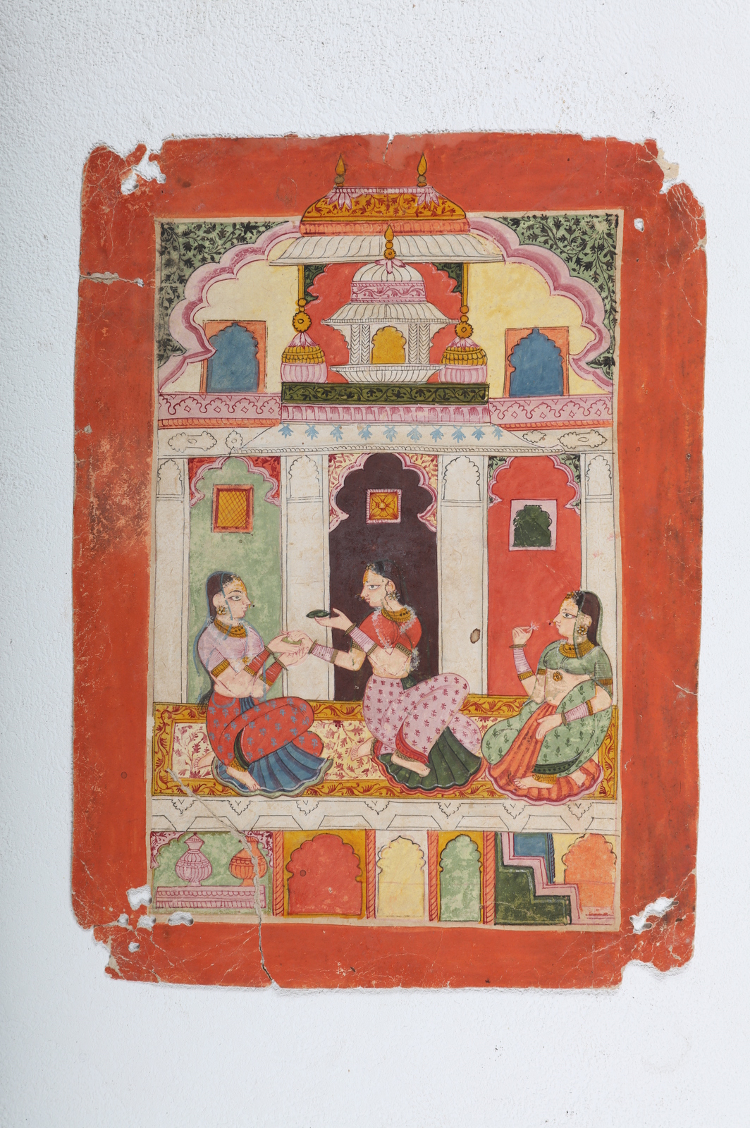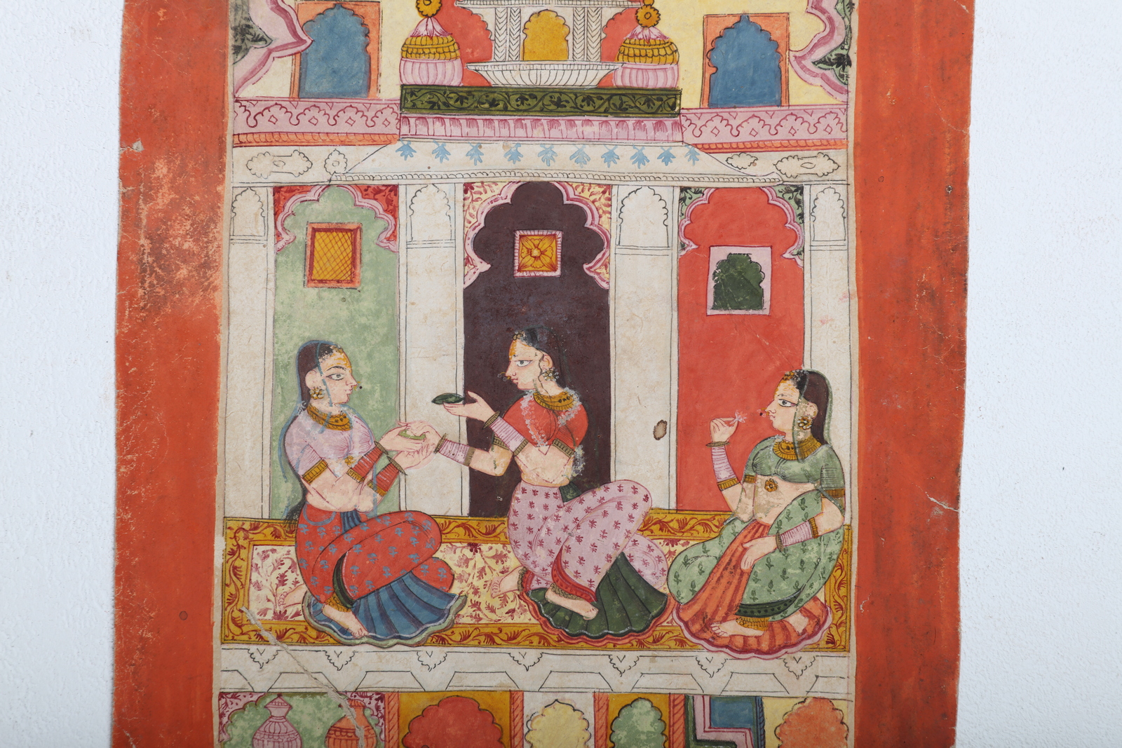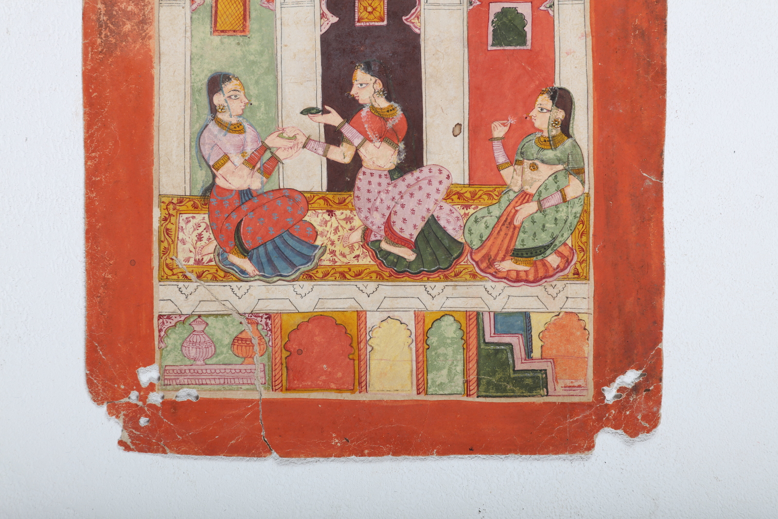 Arte Indiana Gunkali Importante miniatura tratta da Ragamala India, Rajasthan Sud Occidentale, scuola di Sirohi, 1680 ca. . -. Cm 16,50 x 22,20. Cfr. lotto precedente per inquadramento storico. Miniatura raffigurante tre donne sedute su una terrazza all'esterno di un lussuoso palazzo, il cui colonnato richiama ed inquadra le protagoniste, ognuna delle quali reca in mano delle foglie di paan. La composizione è inquadrata nella consueta cornice rossa (fori in prossimità dei quattro angoli dovuti ad insetti che hanno mangiato la colla organica) e sul retro è visibile una scritta in Devanagari che nomina il soggetto Gunkali (Gujari).