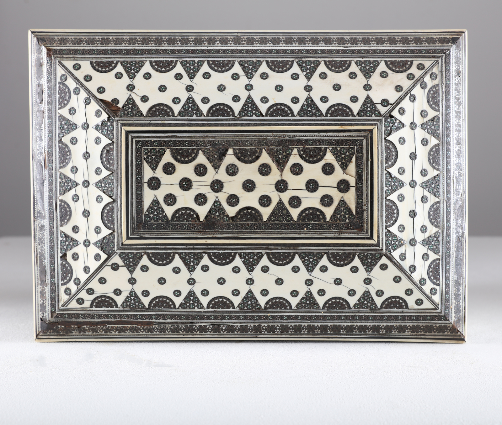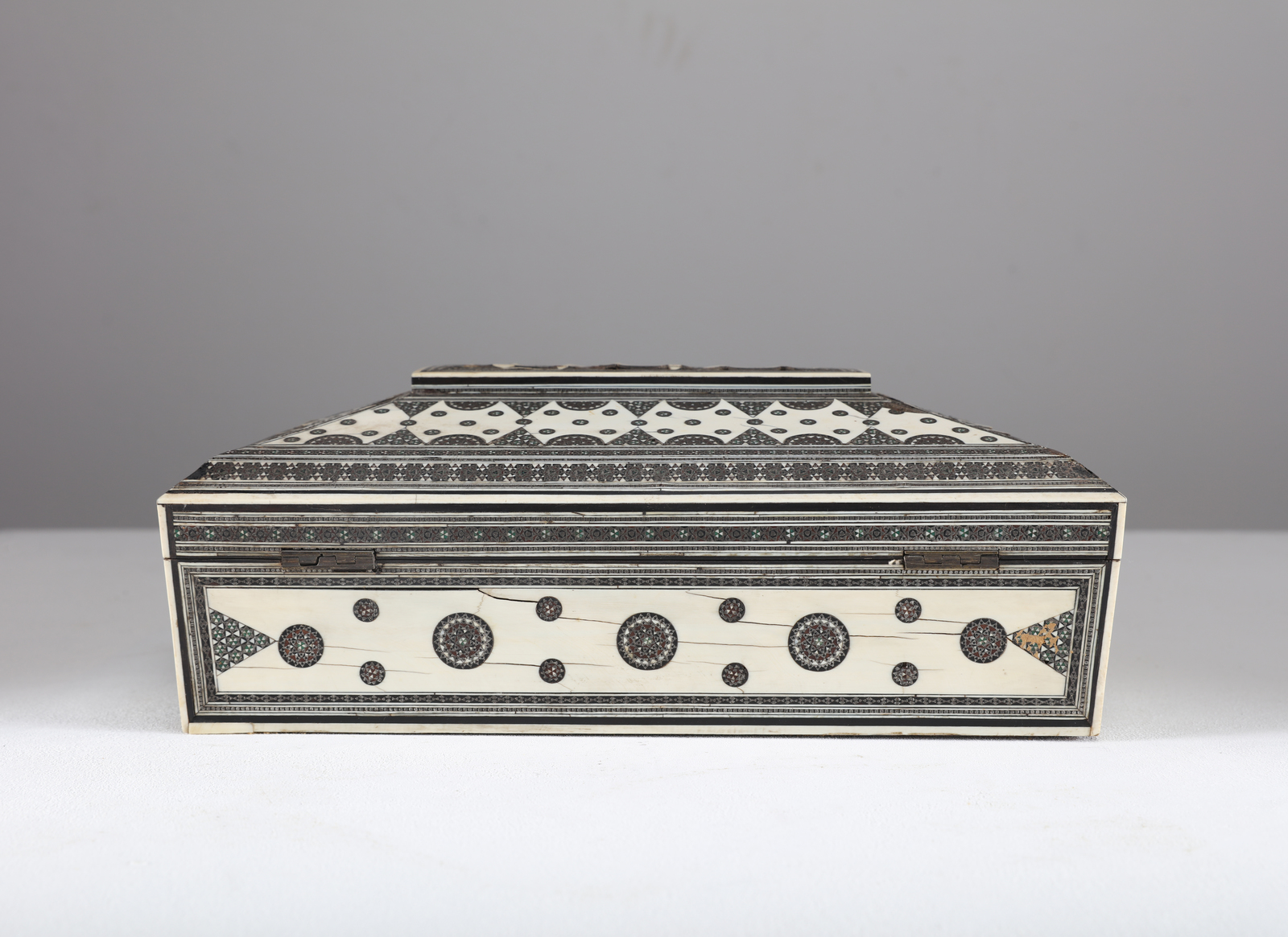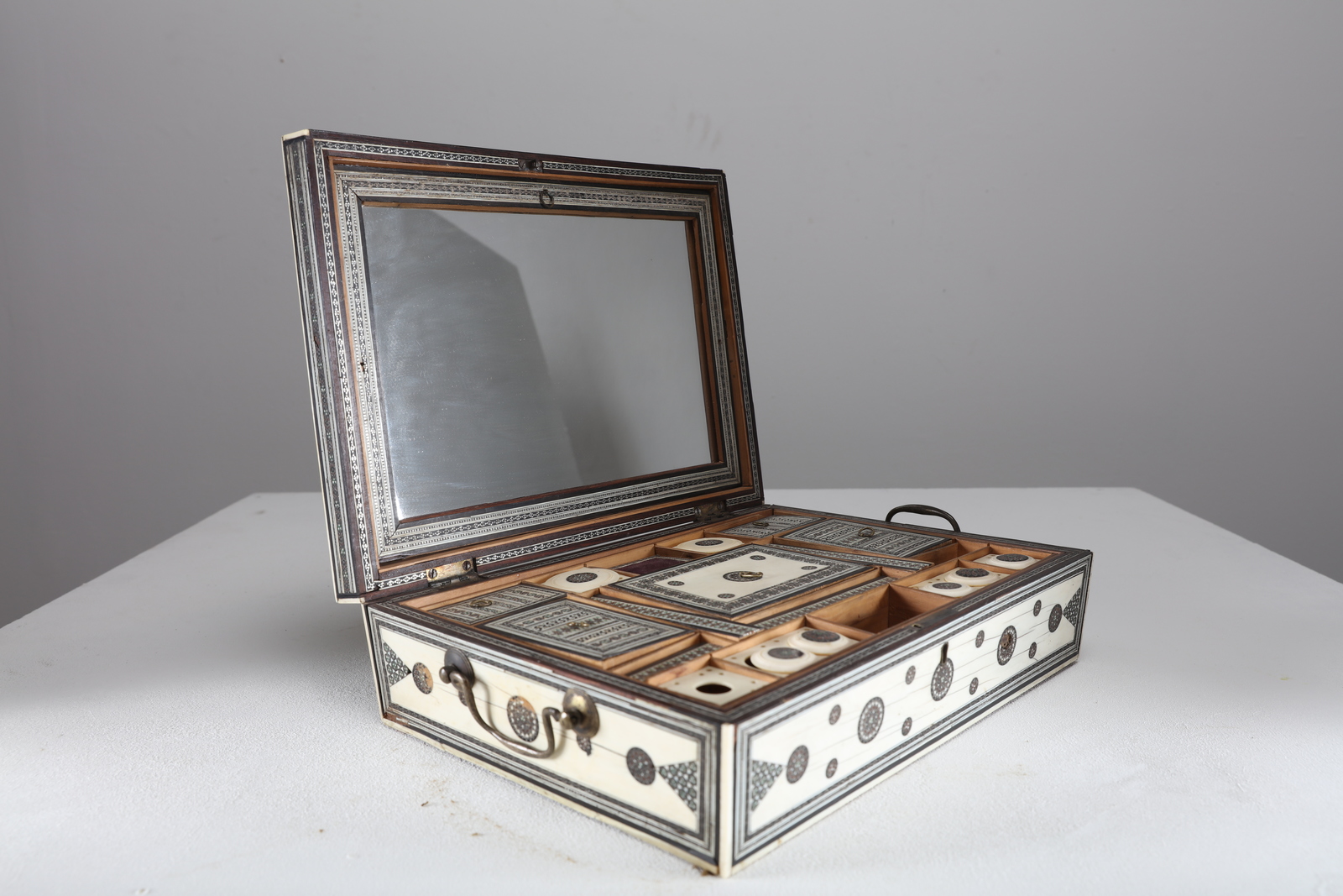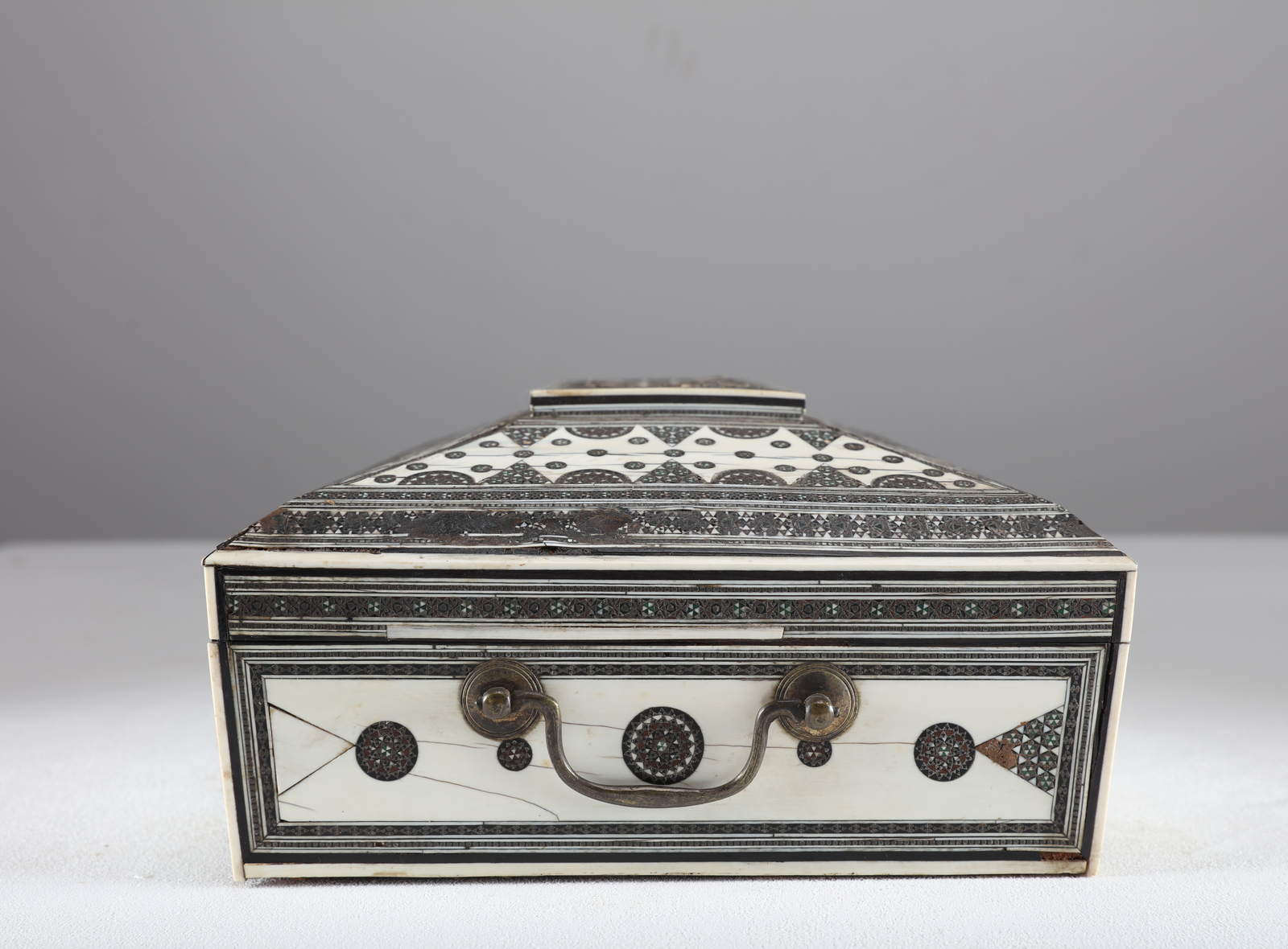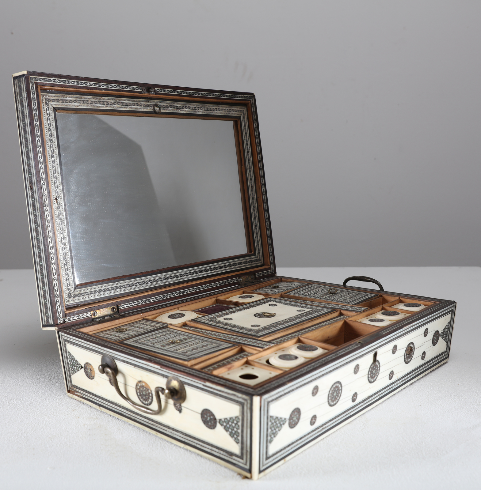 Arte Indiana Scatola indiana in avorio e legno India, XIX secolo . -. Cm 31,00 x 8,50 x 8,00. Deliziosa scatola con coperchio incernierato e completo di specchio nella sua parte interna. L'esterno e la copertura degli scompartimenti interni lavorati con micro intarsi che producono una decorazione geometrica. Manici sui lati ed accessori all'interno. Piccole mancanze.