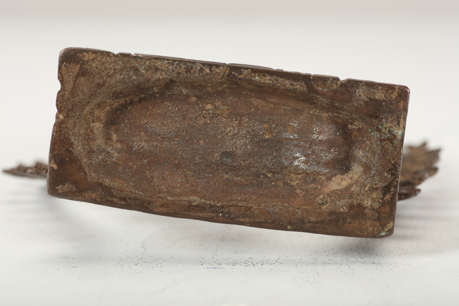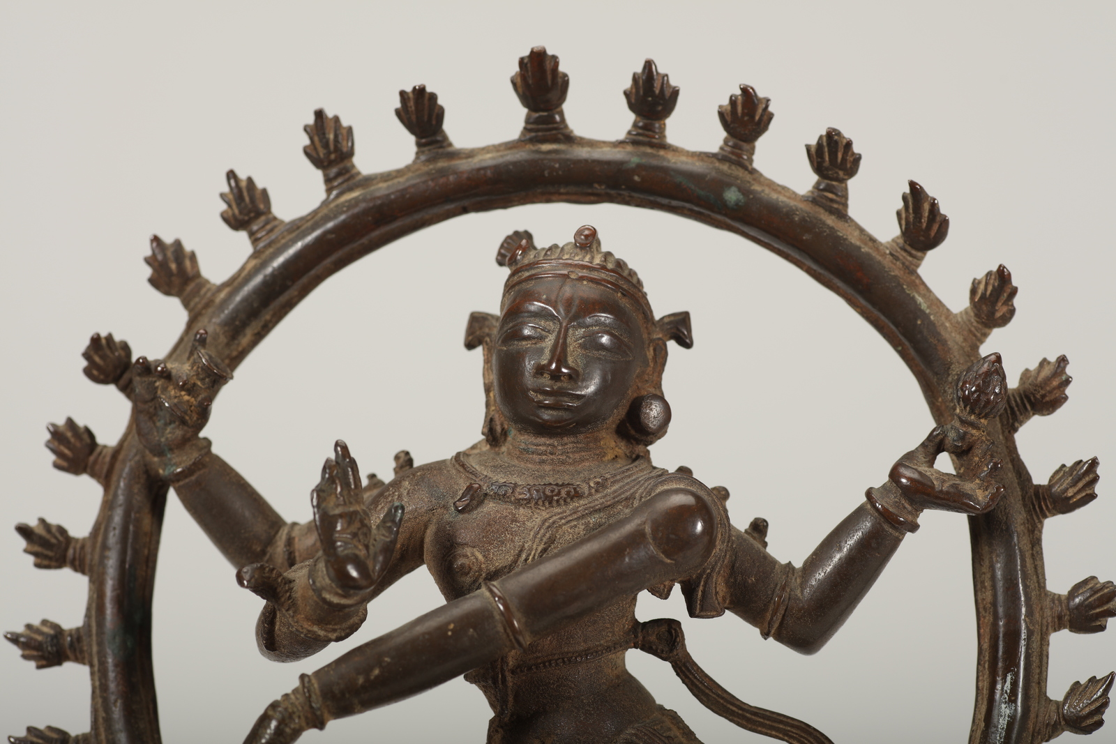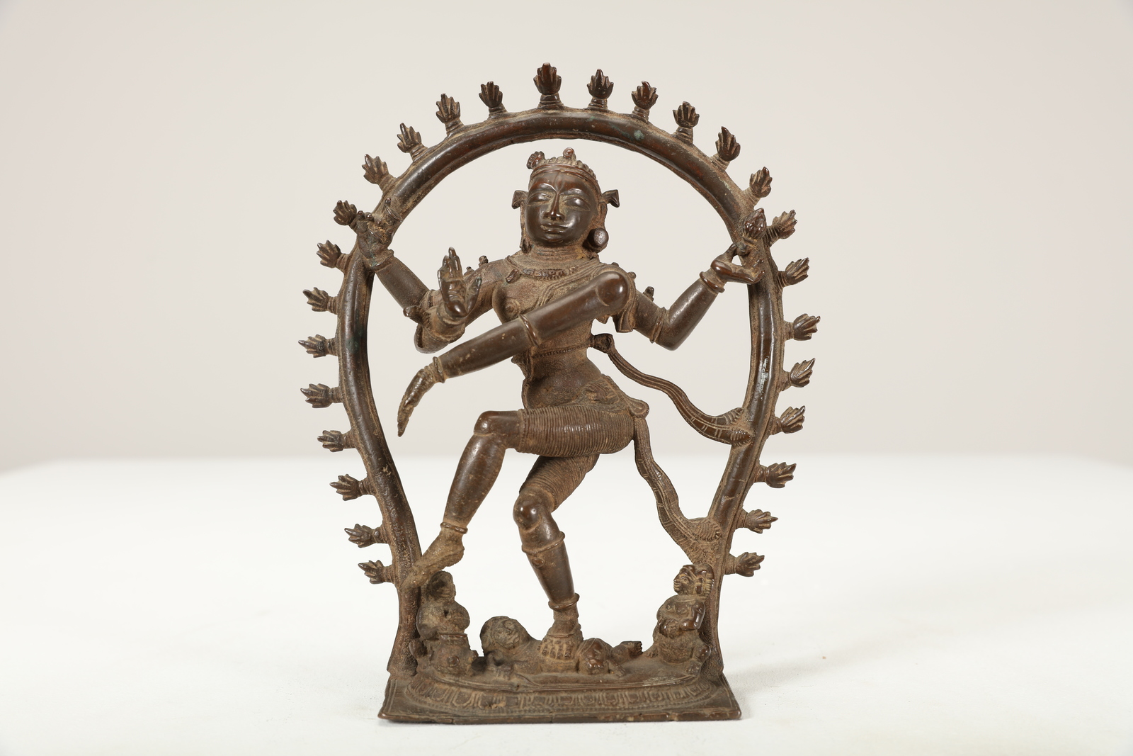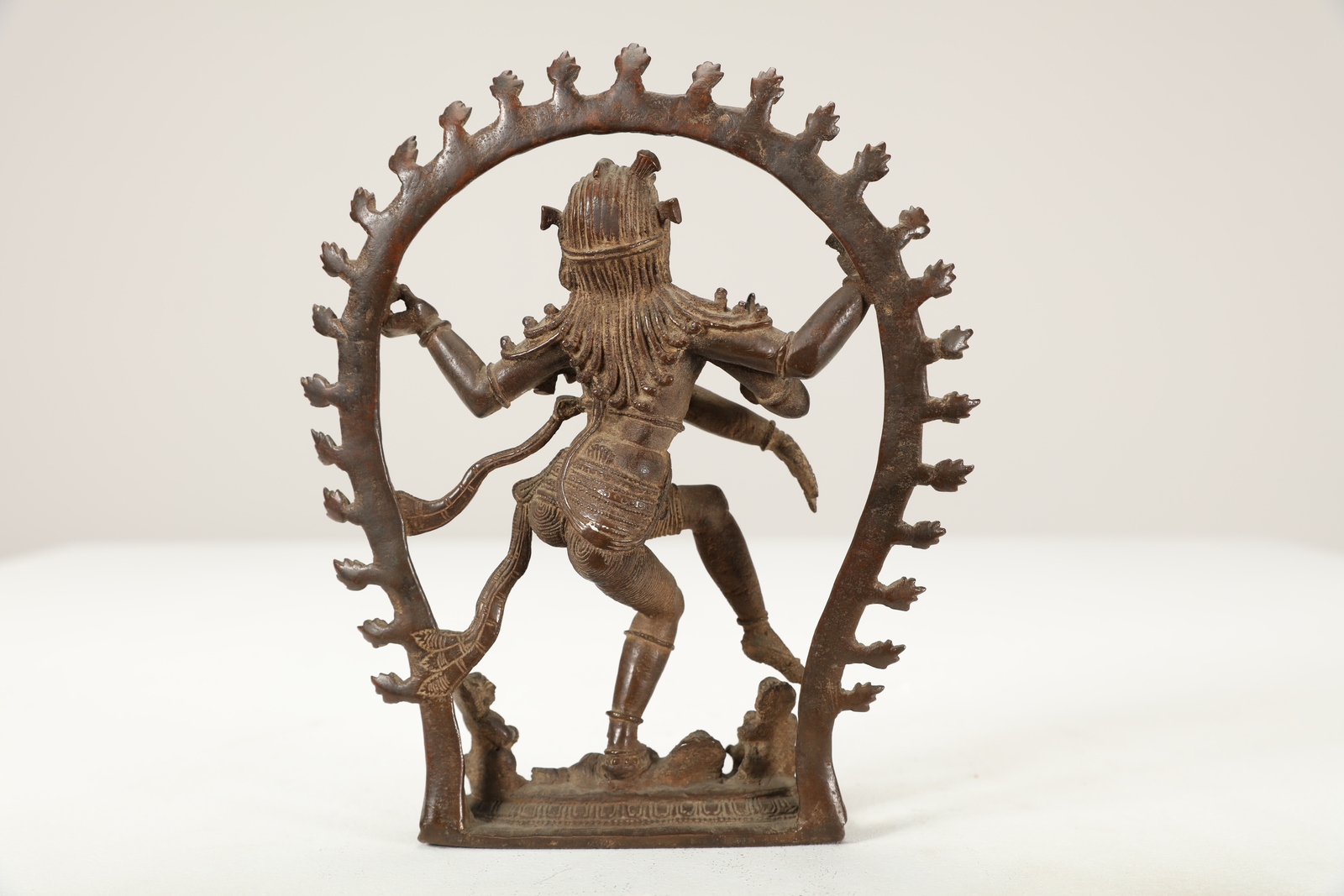 India meridionale, Tamil Nadu, XVI secolo. -. Cm 19,50. Fusione in bronzo raffigurante Shiva nella sua versione di divinità distruttrice che danza all'interno del cerchio di fuoco, schiacciando con il suo piede destro il nano dell'ignoranza (Apasmara). Il personaggio è raffigurato con quattro braccia: la destra in abhayamudra e la sinistra che indica il piede sollevato durante la danza a significare liberazione, mentre le due secondarie reggono due attributi: il tamburello ed il fuoco.