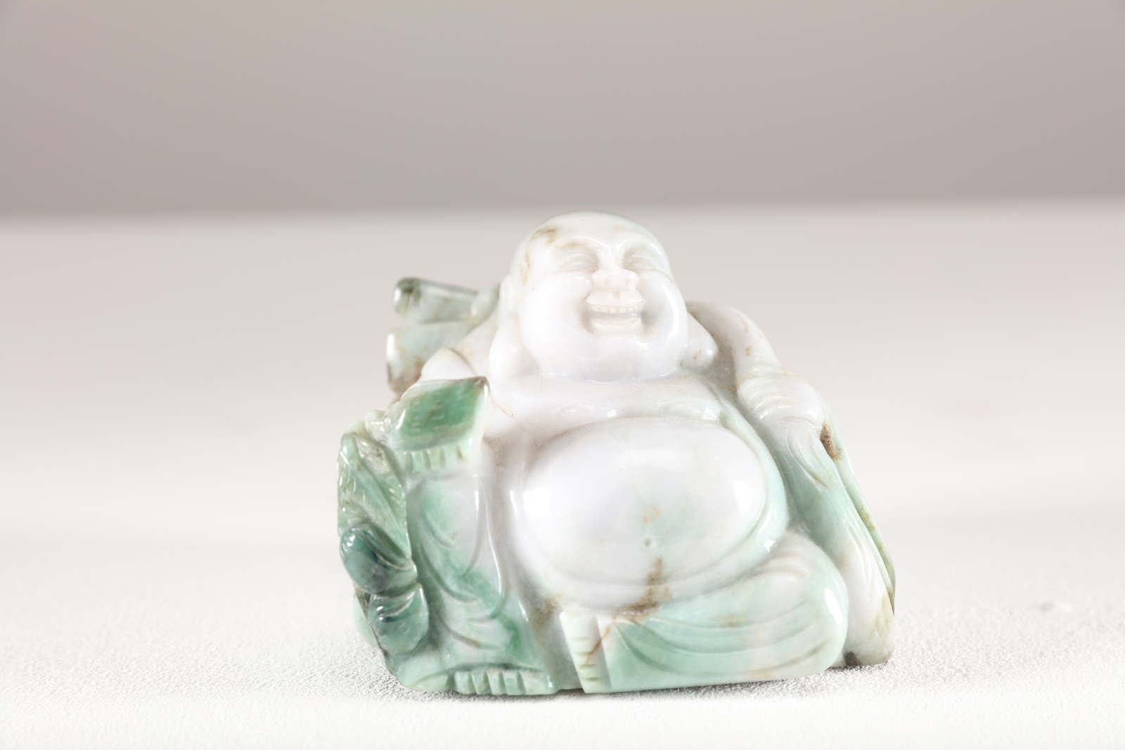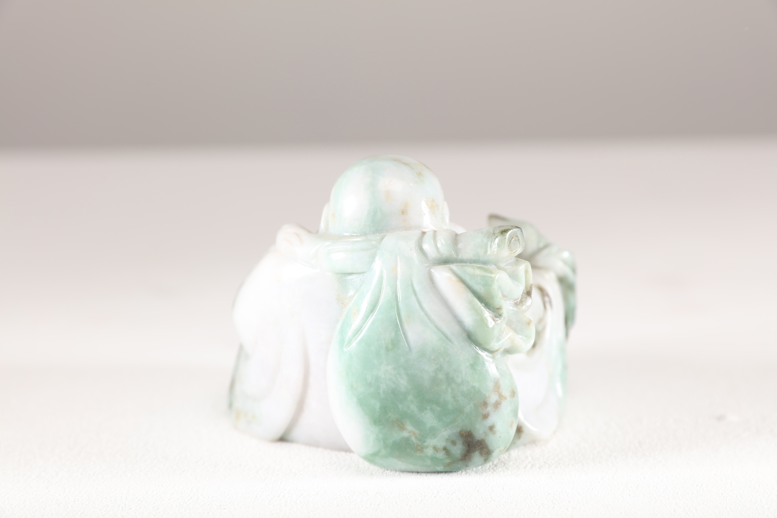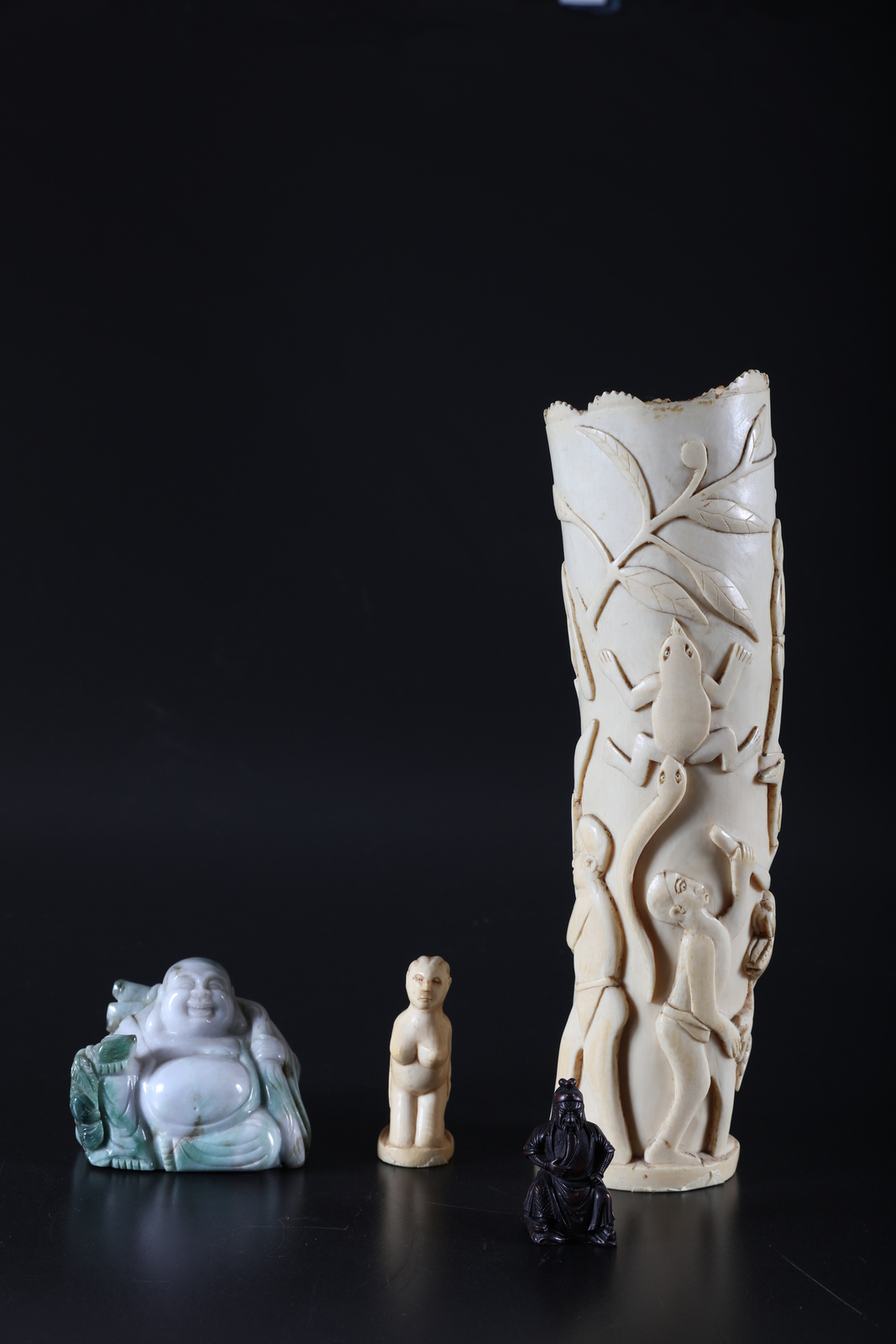 Arte Cinese A group of wooden, ivory and pottery items China, Africa and Japan, 20th century . . Cm 33,50. An ivory statue (h. 9 cm), a carved elephant tusk (33,5 cm), Budhai (h.8 cm) and a wooden carved Taoist figure (h. 6 cm).