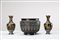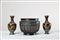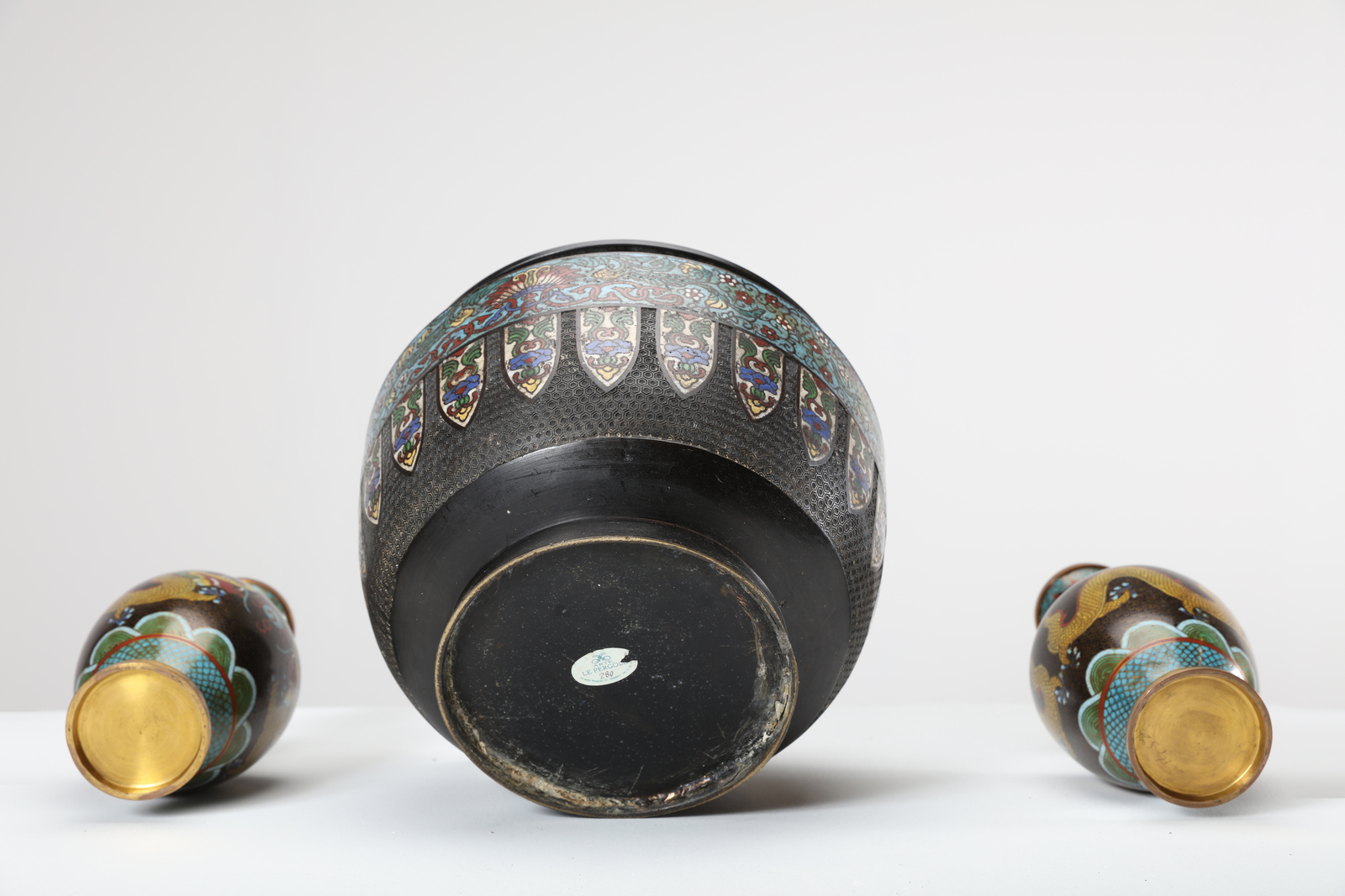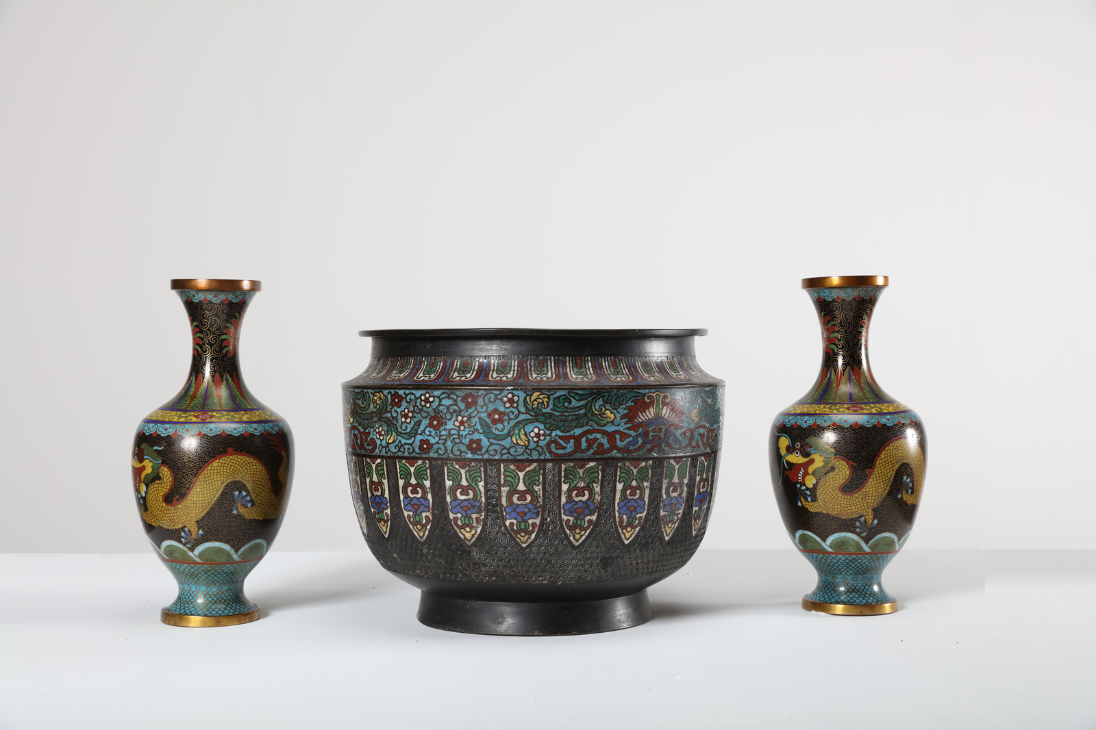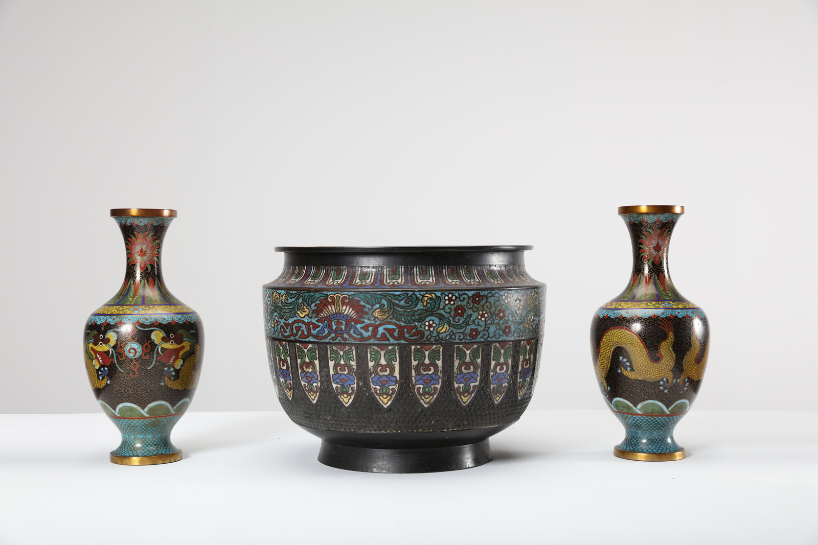 Arte Cinese A goup of cloisonné objects: a pair of vases decorated with dragons and peonies and a bronze enamelled cachepot China/Japan, 19th - 20th century . . Cm 28,00.