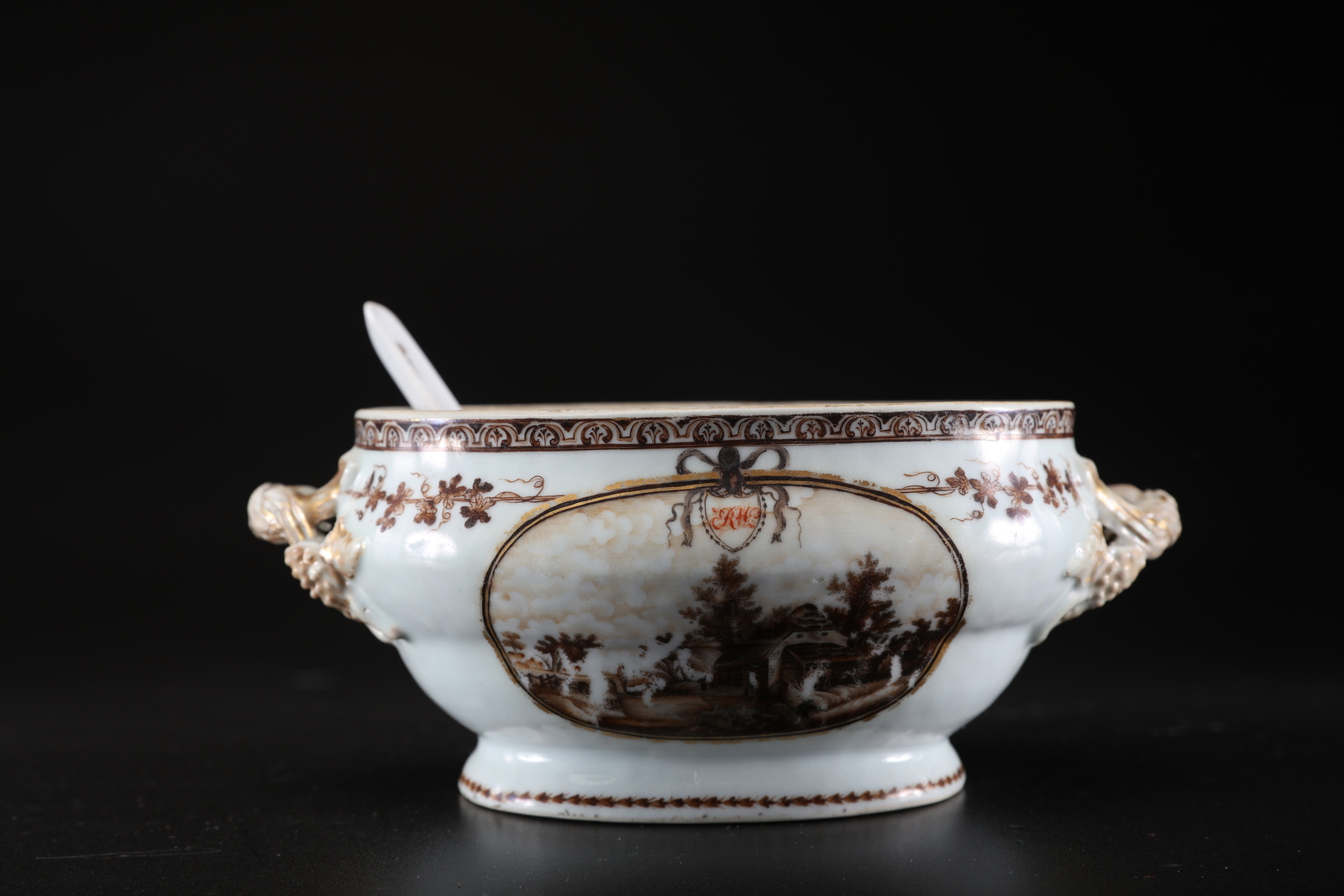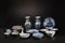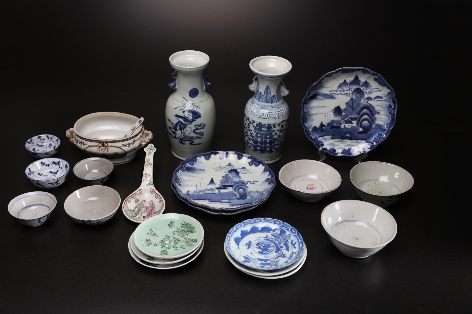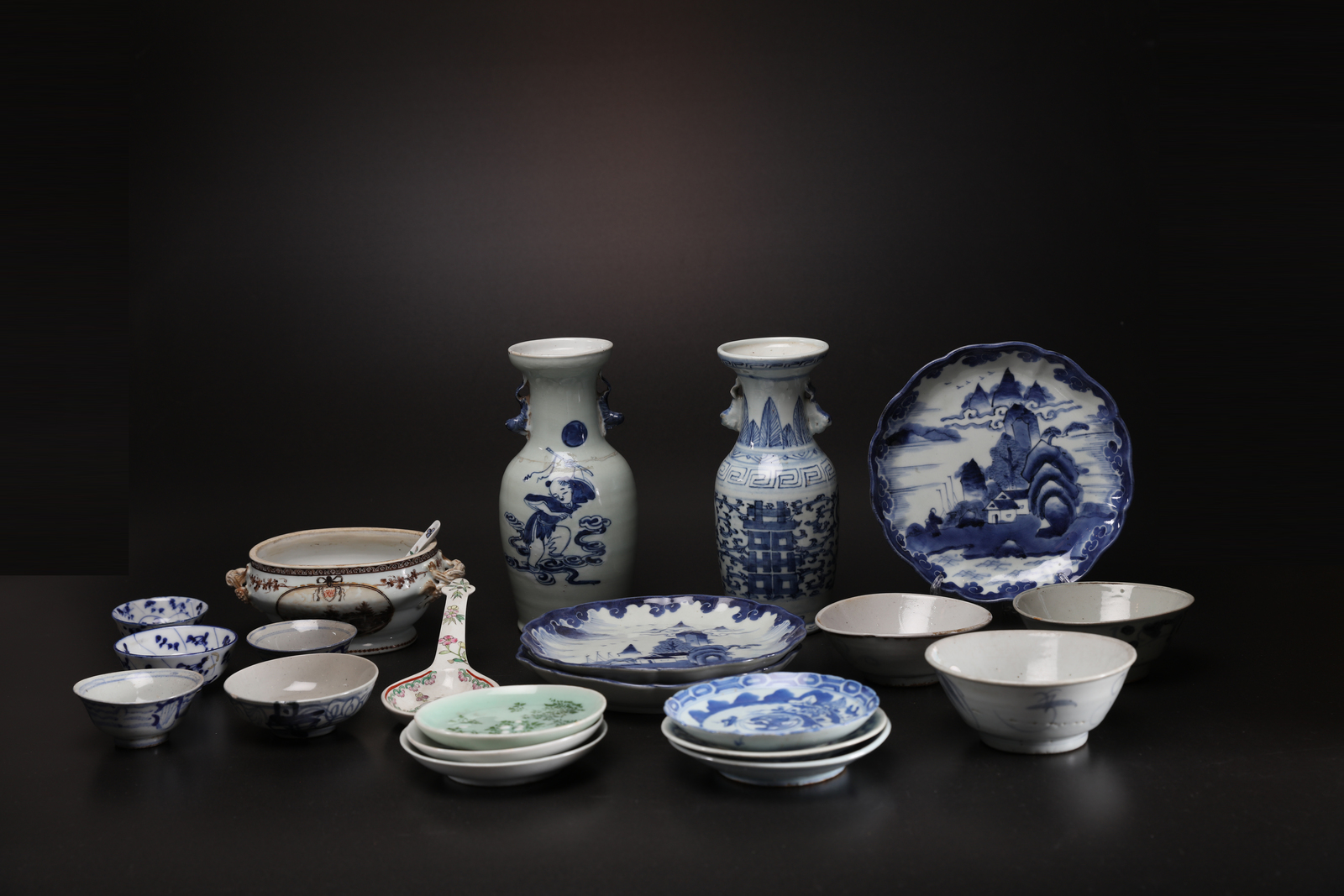 Arte Cinese A group of twenty-two pottery items including two vases, eight bowls, nine dishes and a tureen China, 18th - 19th century . . Cm 21,00. A group of six small pottery dishes: four underglaze painted and two polychrome enamelled bearing marks at the base.The widest 14 cm A group of three lobed blue and white underglaze painted dishes. Diam. 21 cm Two underglaze blue painted vases (restorations) the highest 25 cm A group of eight blue and white bowls. The widest 13,5 cm A chinoiserie tureen without cover 20 X 8,5 cm Two enamelled spoons bearing a red seal mark at the base. The longest 22 cm