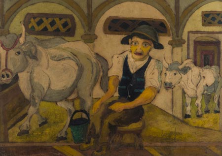Giuseppe Serafini Montelupo Fiorentino (Fi) 1915 Montelupo Fiorentino (Fi) 1987 La stalla, , Olio su cartone inciso, cm. 50x70 Firmato in basso a destra; Sul verso: firma e titolo.