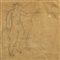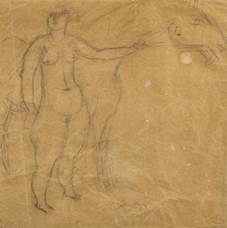 Luigi Spazzapan Gradisca D'isonzo (Go) 1889 Torino 1958, Nudo con cavalli, Matita su carta gialla, cm. 37,5x37,5 Firmato in basso al centro; Etichetta e timbro: "Galleria Cadario", Milano, con descrizione; Timbro "Galleria Gissi", Torino.