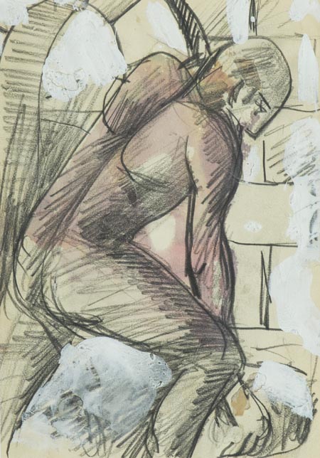 Mario Sironi Sassari 1885 Milano 1961, Figura maschile, 1933 c.a. Matita grassa, tempera e tempera diluita su carta, cm. 23,7x16,3 Sul verso: firma e altra opera. Autentica dell'Associazione per il Patrocinio e la Promozione della figura e dell'opera di Mario Sironi,Milano, su foto con Archivio n° 70/13 RA.