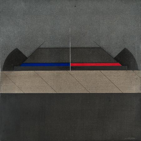 Walter Valentini Pergona (Pu) 1928 , Orizzontale rosso - azzurro, 1975 Olio su tela, cm. 50x50 Firmato in basso a destra. Sul verso: titolo, firma e data. Autentica dell'Artista su foto.