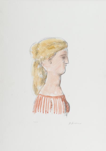Antonio Bueno Berlino 1918 Firenze 1984, Volto di profilo, anni '80 Litografia colorata a mano su carta, cm. 50x35, es. P.A. Firmato in basso a destra. Certificato di provenienza Pistelli Franco, Firenze, su foto.