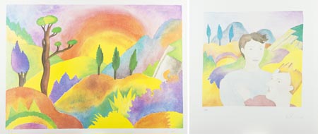 Luca Alinari Firenze 1943 , Lotto unico di due opere, - "Paesaggio", Litografia su carta, cm. 70x98,5, es. P.A., firmato in basso a destra; - "Paesaggio e figure", Litografia su carta, cm. 68,5x67,5, es. P.A., firmato in basso a destra.