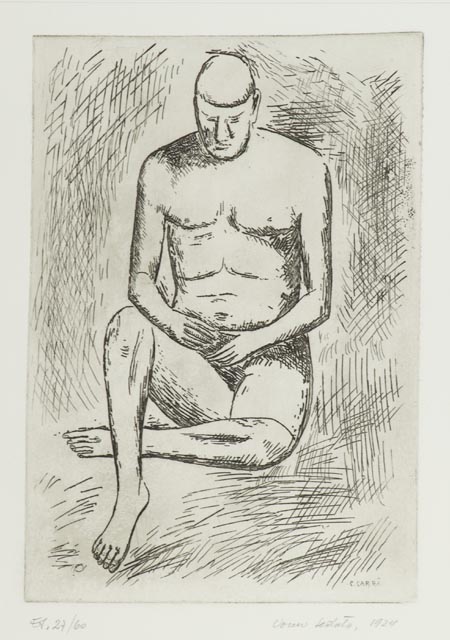 Carlo Carrà Quargnento (Al) 1881 Milano 1966, Uomo seduto, 1924 Acquaforte di cm. 29x20, su carta di cm. 50x35, es. 27/60 Firmato sulla lastra, titolo e data in basso a destra tiratura in basso a sinistra.