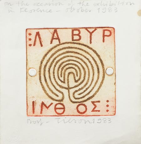 Joe Tilson Londra 1928 , Senza titolo, 1983 Acquaforte e acquatinta di cm. 15x15, su carta di cm. 25x24, es. P.A. Firma e data in basso a destra, timbro a secco Edizioni "Dabbeni Lugano" in basso a sinistra. Scritto descrittivo dell'Artista in Alto.