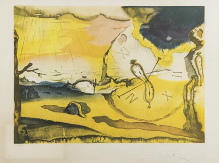 Salvador Dalì Figuera 1904 1989, Orologi molli, 1971 Litografia su carta, cm. 50x70, es. 70/195 Firma in basso a destra, tiratura e timbro a secco in basso a sinistra; Sul verso: Timbro: "Museo Perrot - Moore", Cadaques, con descrizione; Timbro: "Editions d'Art Les Heure Claires", Paris.