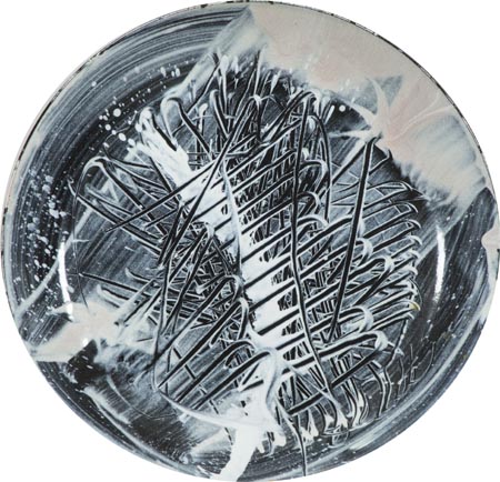 Emilio Scanavino Genova 1922 Milano 1986, Senza titolo, Olio su piatto di metallo, diametro cm. 24 Sotto la base: firma.