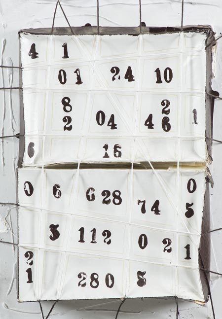 Luca Vallecchi Firenze 1972 , Scatole emotive, 2008 Smalti, cartone e corde su tavola, cm. 36x25x7 Sul verso: firma. Autentica dell'Artista su foto.