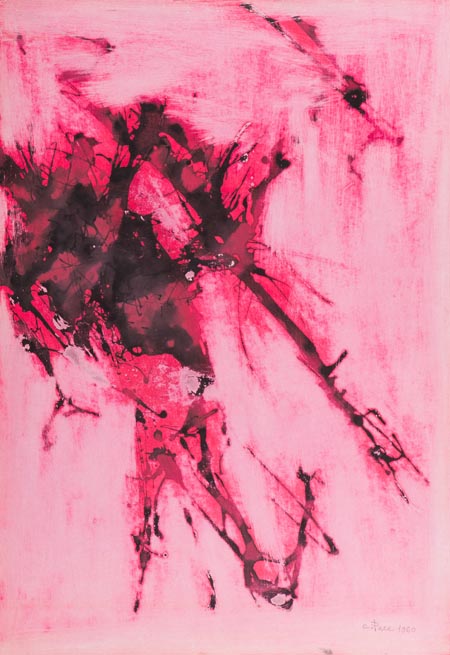 Carlo Pace Roma 1931 2003, Senza titolo, 1960 Tecnica mista su cartone fluorescente intelato, cm. 70x50 Firma e data in basso a destra; Sul verso: firma e data. Bibliografia: Carlo Pace, Opere dal 1952 al 2010, pag. 39. Autentica dell'Artista su foto con Arch n° A/50