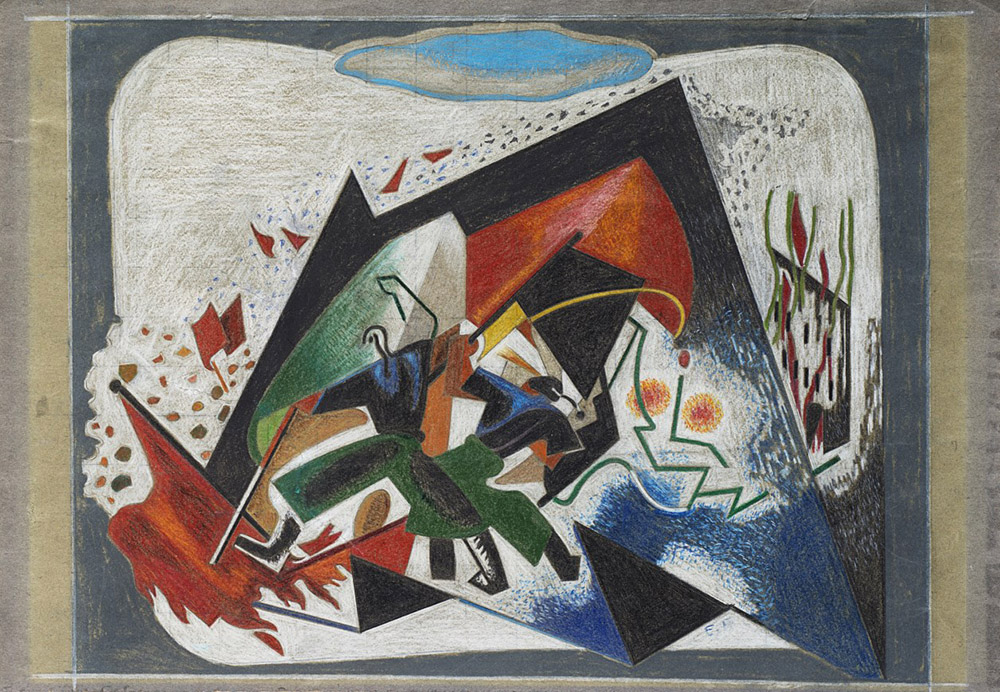 Enrico Prampolini (Modena 1894 - Roma 1956) "I Decennale R.F. (Gli arditi del 15 aprile 1919)" 1932 bozzetto per l'allestimento della Mostra per il Decennale della Rivoluzione Fascista tecnica mista su carta, cm 35x50,5 Siglato in basso a destra Bibliografia J. Joll "Cento anni d'Europa 1870/1970" Vol. III, Universale Laterza, 1980 E. Crispolti "Prampolini dal Futurismo all'Informale" Roma, Edizioni Carte Segrete, 1992, p.345, tav.4/A/5 (riprodotto il pannelllo esposto, cm 500x600) Opera accompagnata da certificato di autenticità su fotografia rilasciato da Anna Maria Prampolini in data 23 luglio 1985 Opera registrata presso l'Archivio Enrico Prampolini, Roma, a cura di Massimo Prampolini, il quale ha sottolineato che si tratta di un'opera di notevole valore storico Enrico Prampolini (Modena 1894 - Roma 1956) "I Decennale R.F. (Gli arditi del 15 aprile 1919)" 1932 sketch for the Exhibition of the Fascist Revolution mixed media on paper, cm 35x50,5 Signed lower right with the initials Literature J. Joll "Cento anni d'Europa 1870/1970" Vol. III, Universale Laterza, 1980 E. Crispolti "Prampolini dal Futurismo all'Informale", Edizioni Carte Segrete, Roma, 1992, p.345, tav.4/A/5 (riprodotto il pannelllo esposto cm 500x600) Certificate of authenticity on photography by Anna Maria Prampolini dated 23 July 1985 The work is registered at the Archivio Enrico Prampolini, Rome, curated by Massimo Prampolini who highlighted the historical relevance of the work